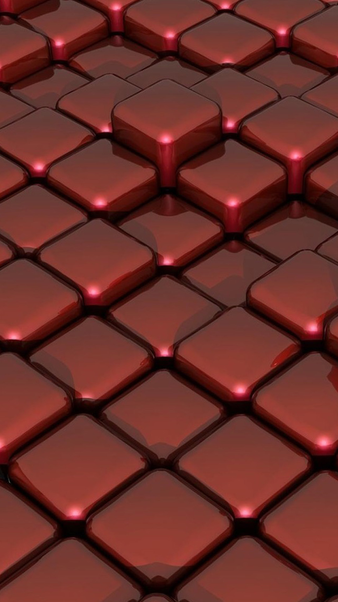 Description: A red background with a lot of square tiles with red lights on them and a red button on the middle.