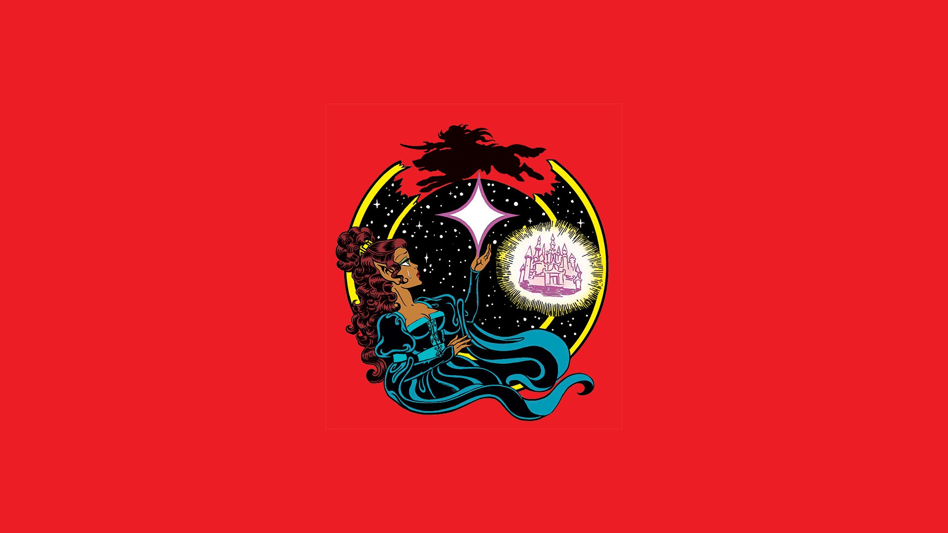 Description: A red background with a picture of a woman and a star in the sky and a palm tree on the right.