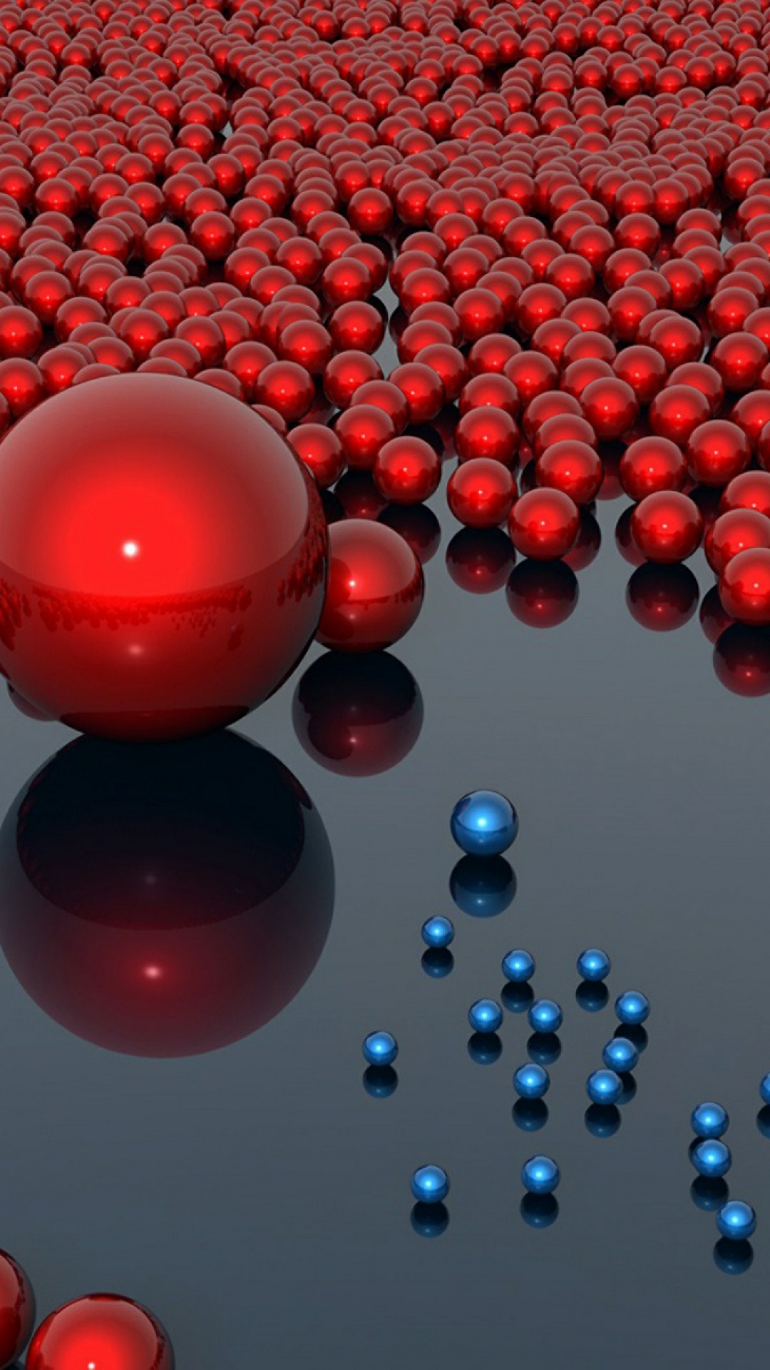 Description: A red ball surrounded by blue balls on a black surface with a reflection of it in the water and a lot of blue balls.