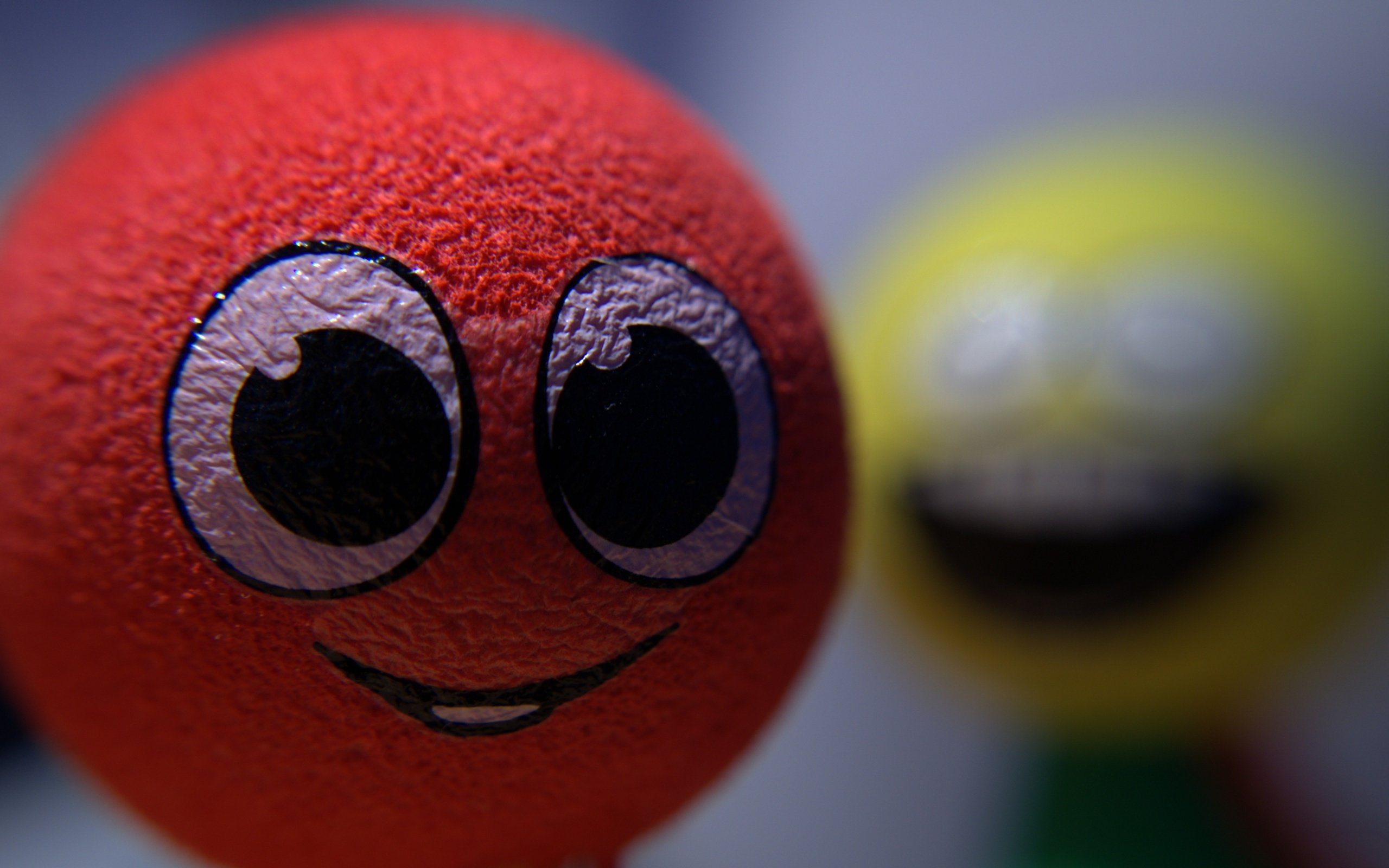 Description: A close up of a red ball with eyes and a yellow ball with a green ball with a black dot.