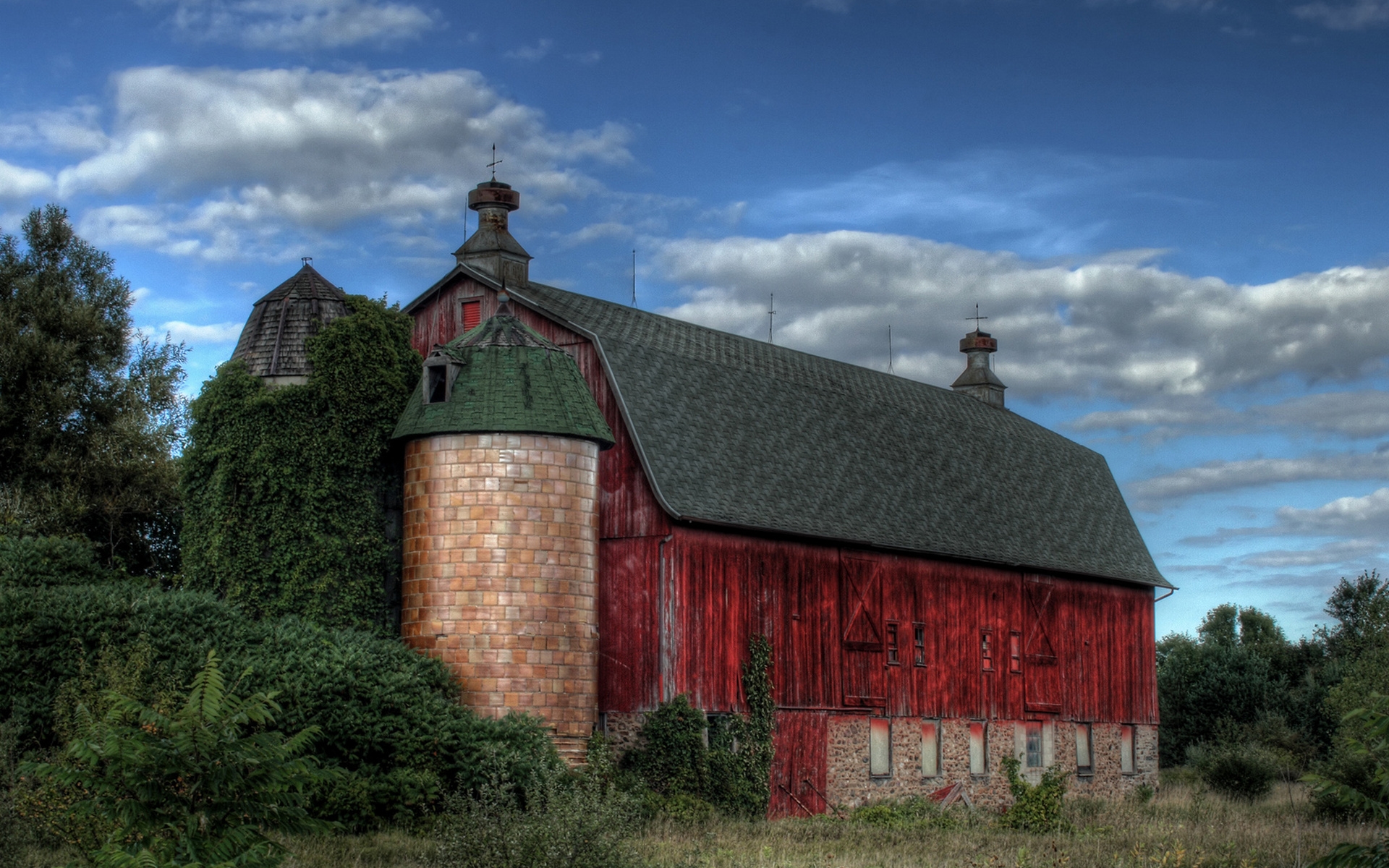 Description: A red barn with a green roof and two chimneys on top of it and a few bushes around it.
