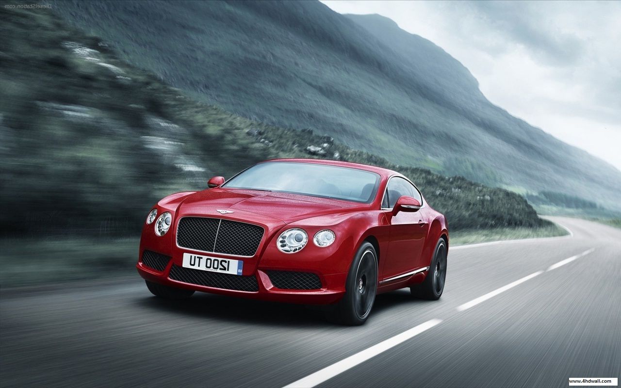 Description: A red bentley car driving down a road near a mountain range in the rain and clouds.