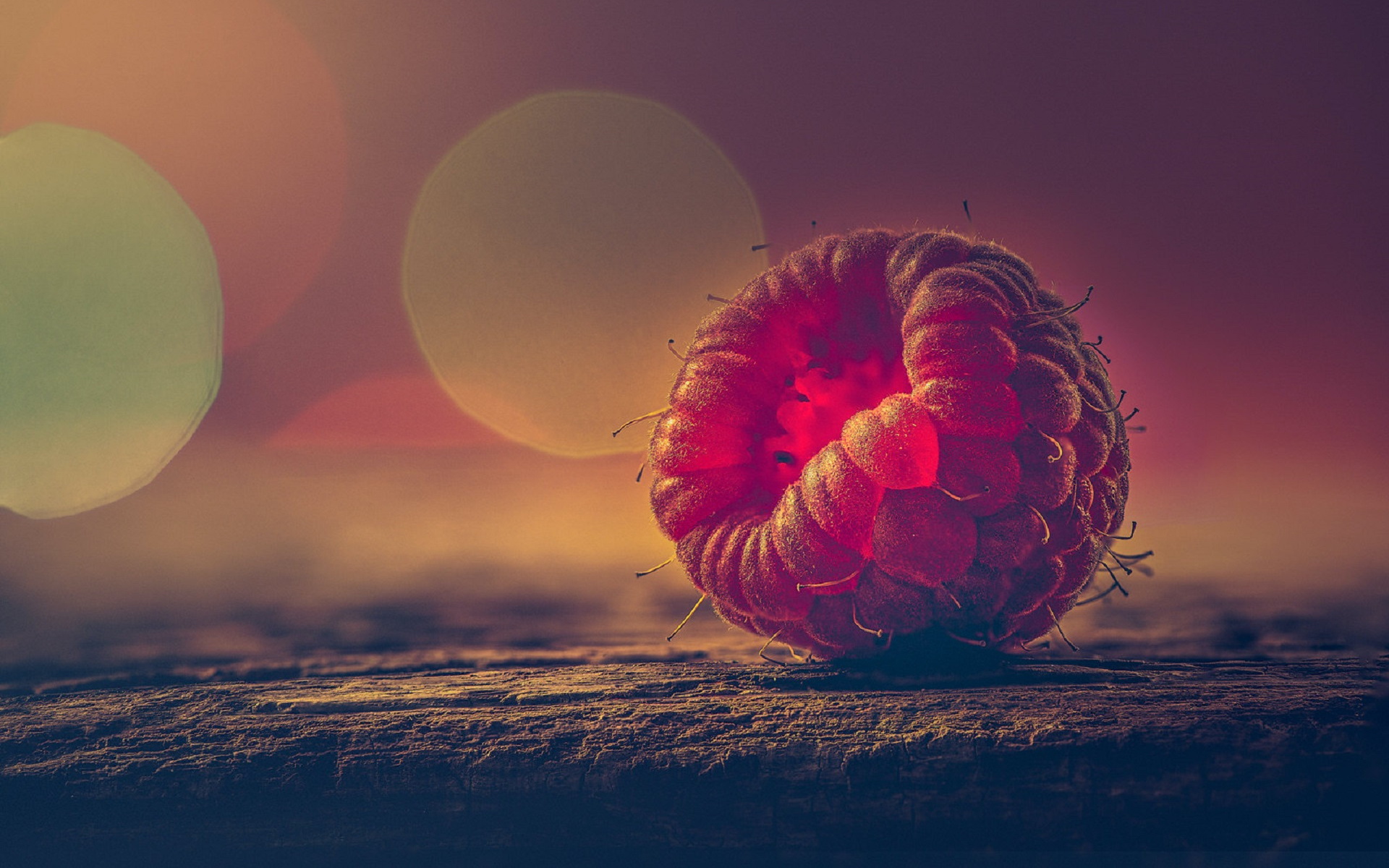 Description: A red object sitting on top of a wooden table next to a blurry background of lights and circles.