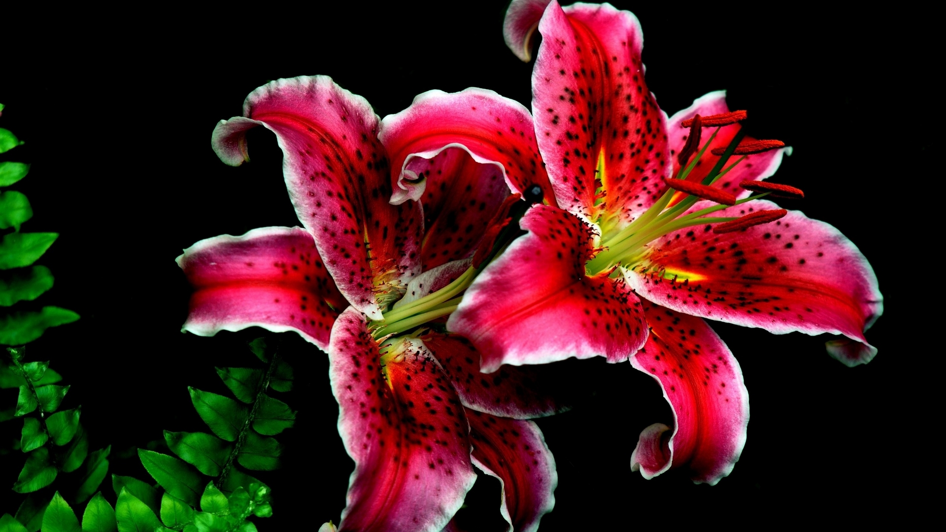 Description: A close up of a flower with a black background behind it and green leaves around it and a black background behind it.