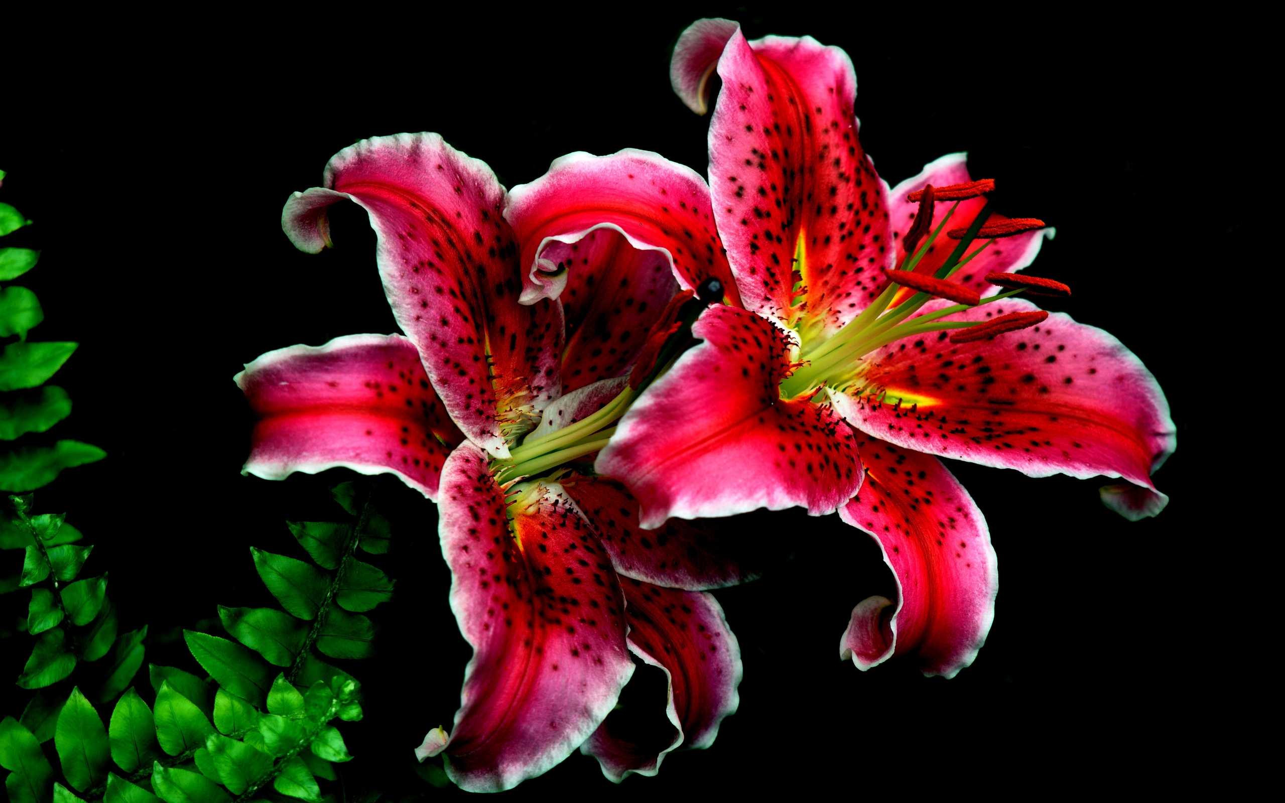Description: A close up of a flower with a black background behind it and a green plant behind it with a black background.