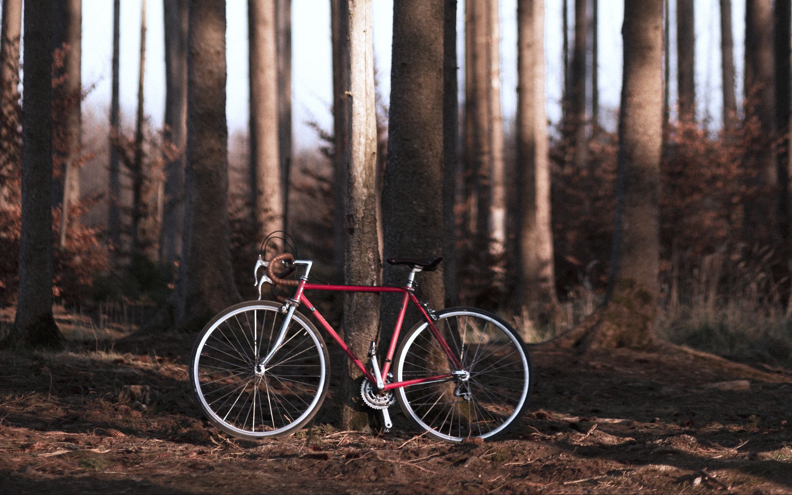 Description: A red bike parked in the middle of a forest with tall trees in the background and a few leaves on the ground.