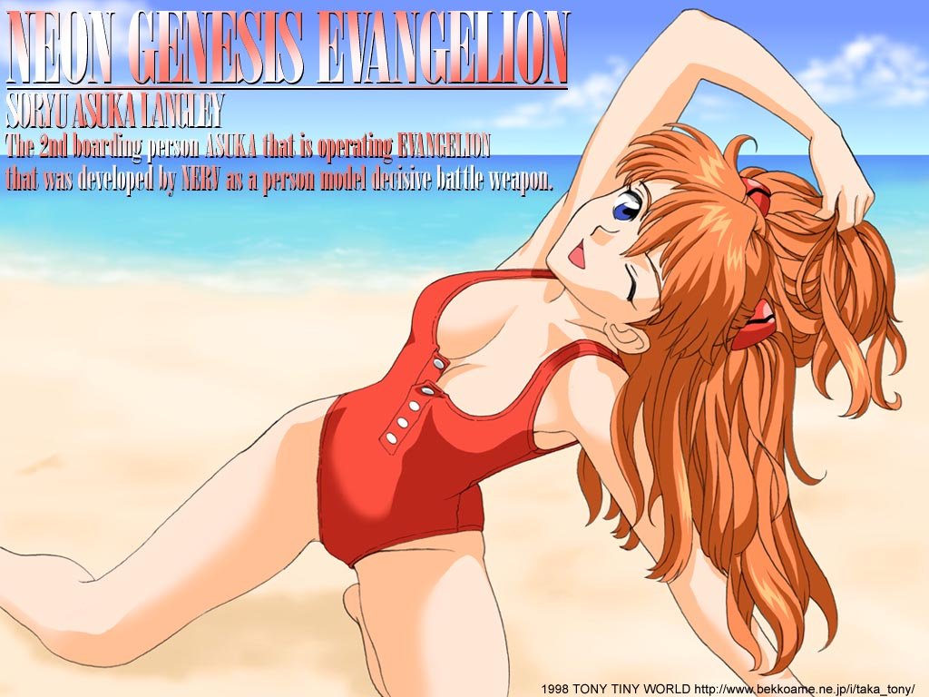 Description: A cartoon of a woman in a red bikini on a beach with a blue sky in the background and a white cloud in the sky.