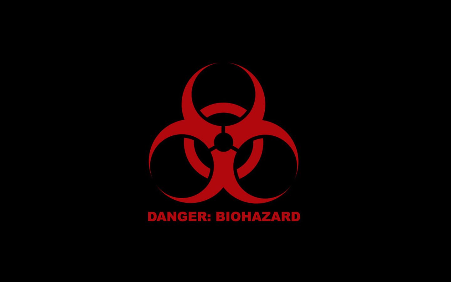Description: A red biohazard sign on a black background with the words danger biohazard on it's side.