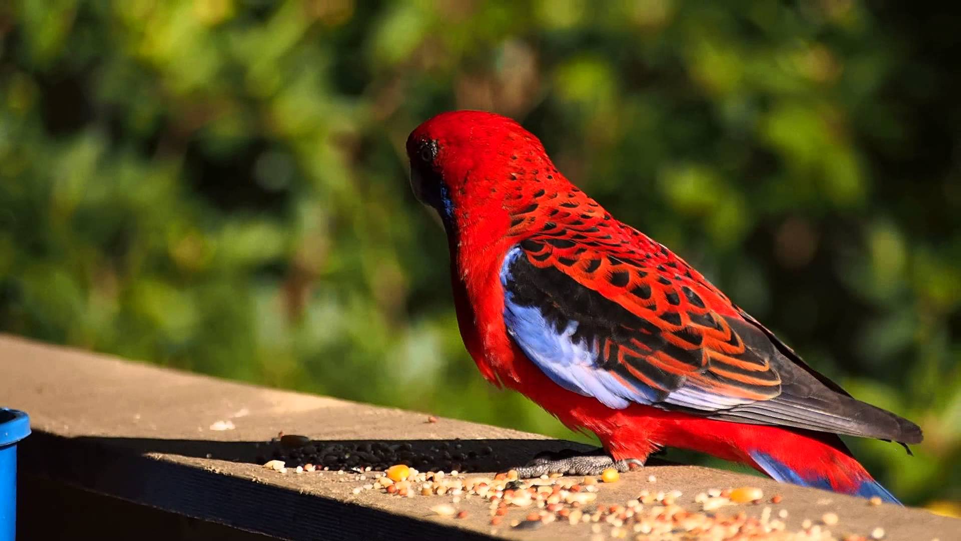 Description: A red bird is standing on a ledge eating seeds from a blue cup on the ground next to it.