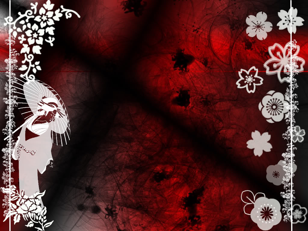 Description: A red and black background with white flowers and a cat on it's side and a black and white border.