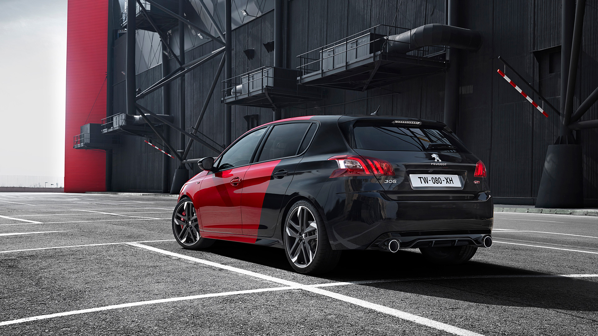 Description: A red and black car parked in a parking lot next to a building with a red and black stripe.