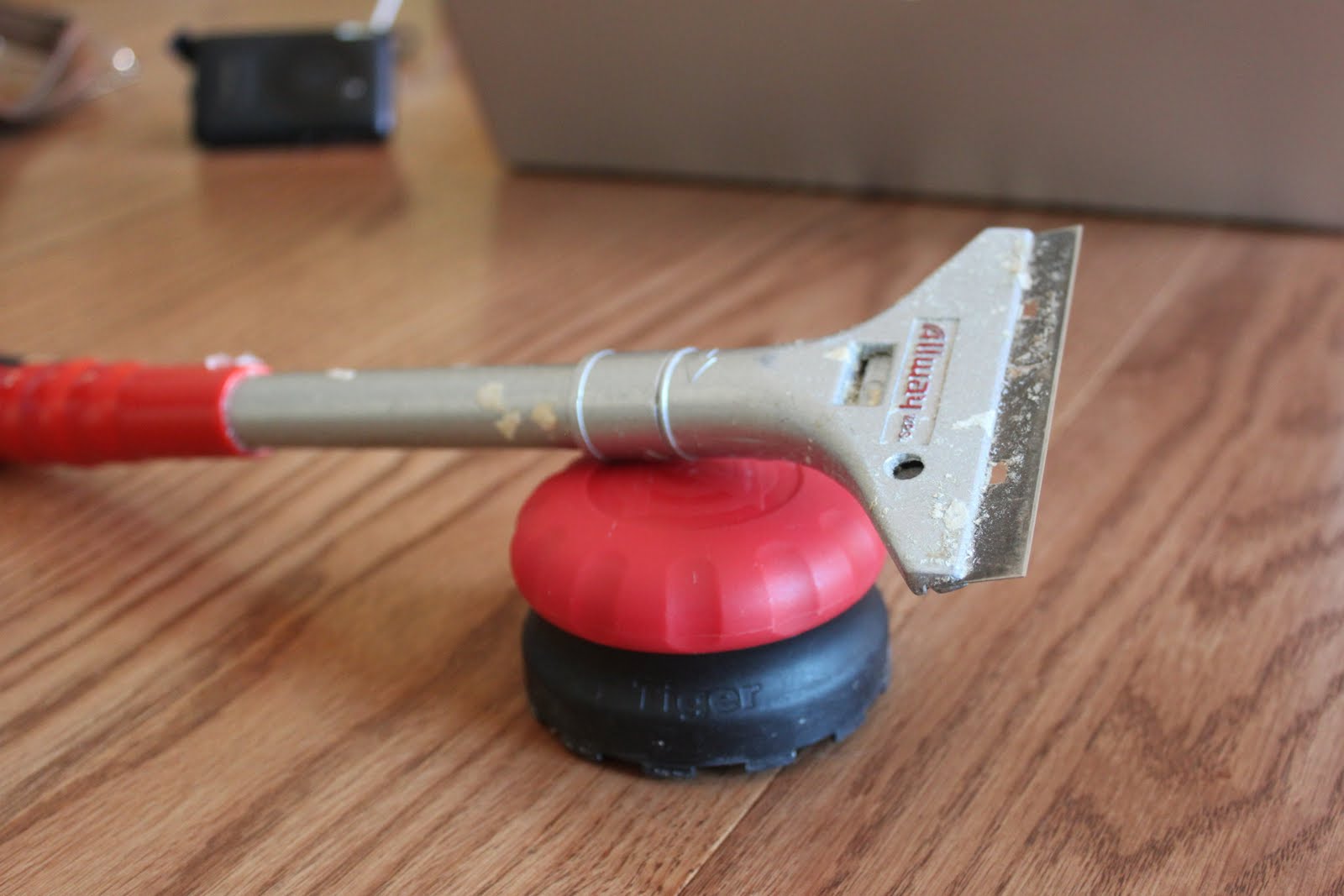 Description: A red and black object on a wooden table with a tool on top of it and a black object on the table.