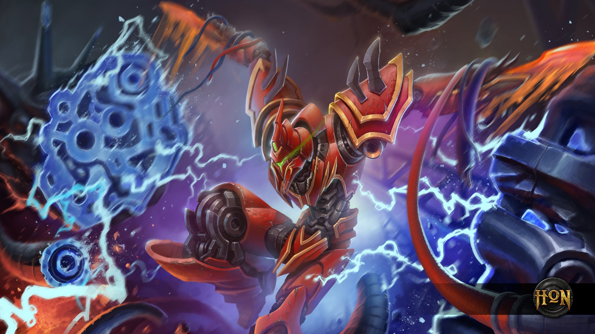 Description: A red and black robot with a lightning effect on it's face and arms.