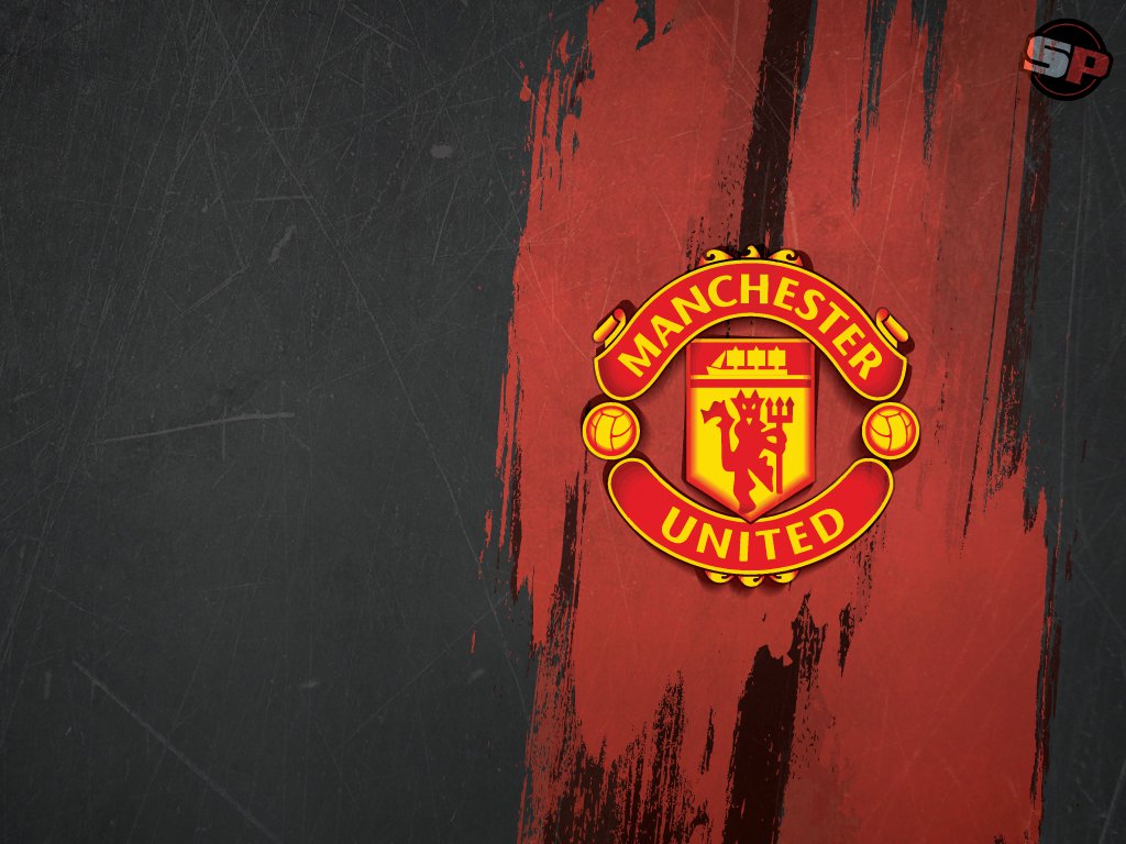 Description: A red and black wall with a manchester united emblem on it's side and a red and black background.