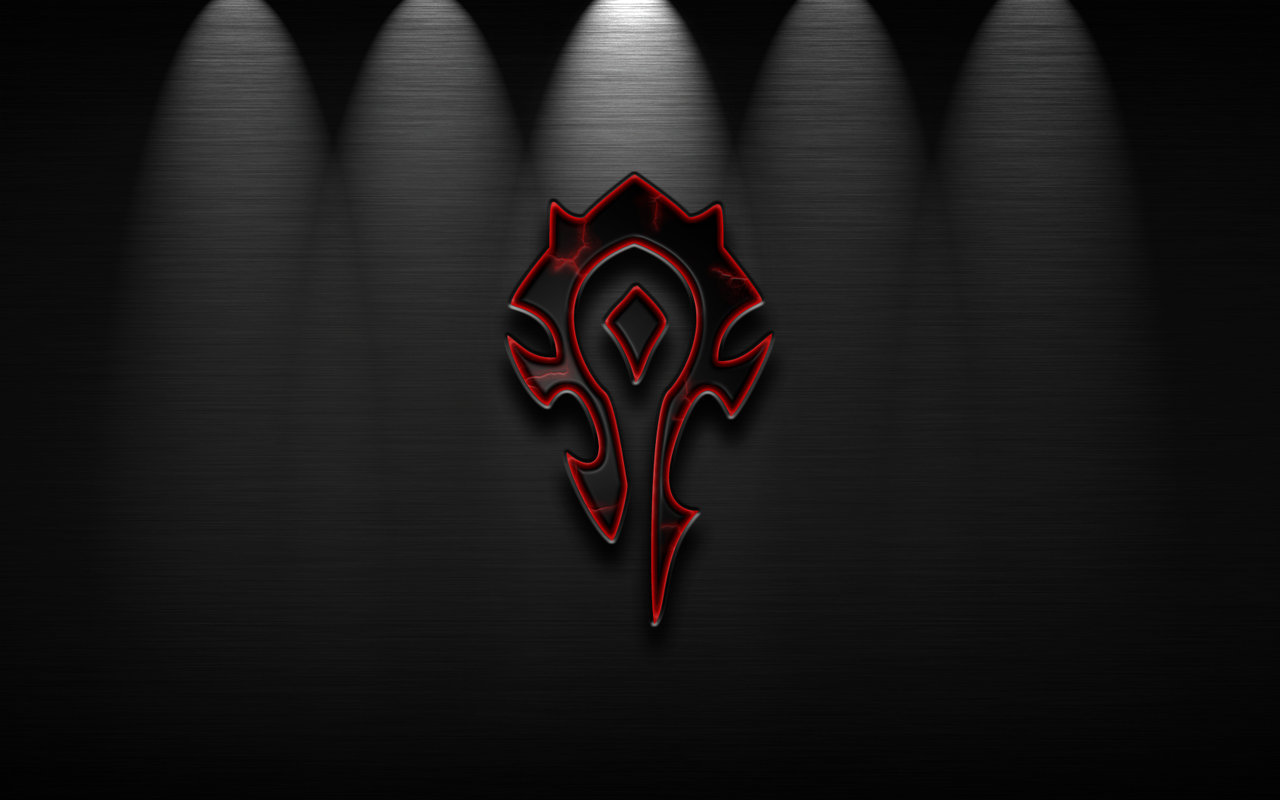 Description: A red and black wallpaper with a red and black logo on it's side and four spotlights on the wall.
