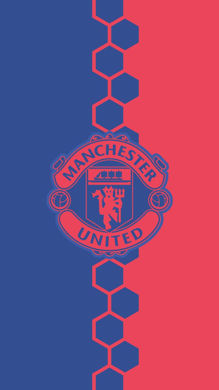 Description: A red and blue background with a manchester united emblem on it's side and a hexagonal pattern.