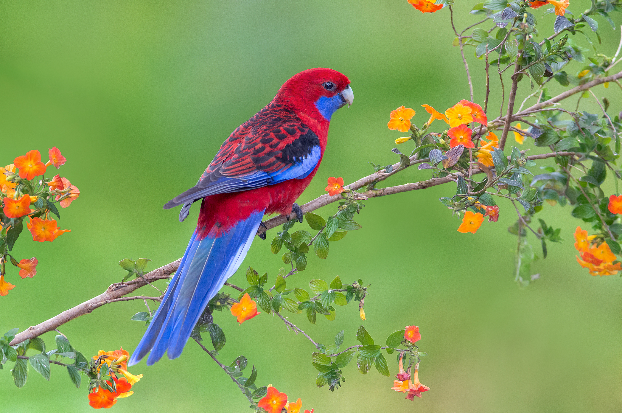 Description: A red and blue bird sitting on a branch of a tree with orange flowers in the background and a green background.