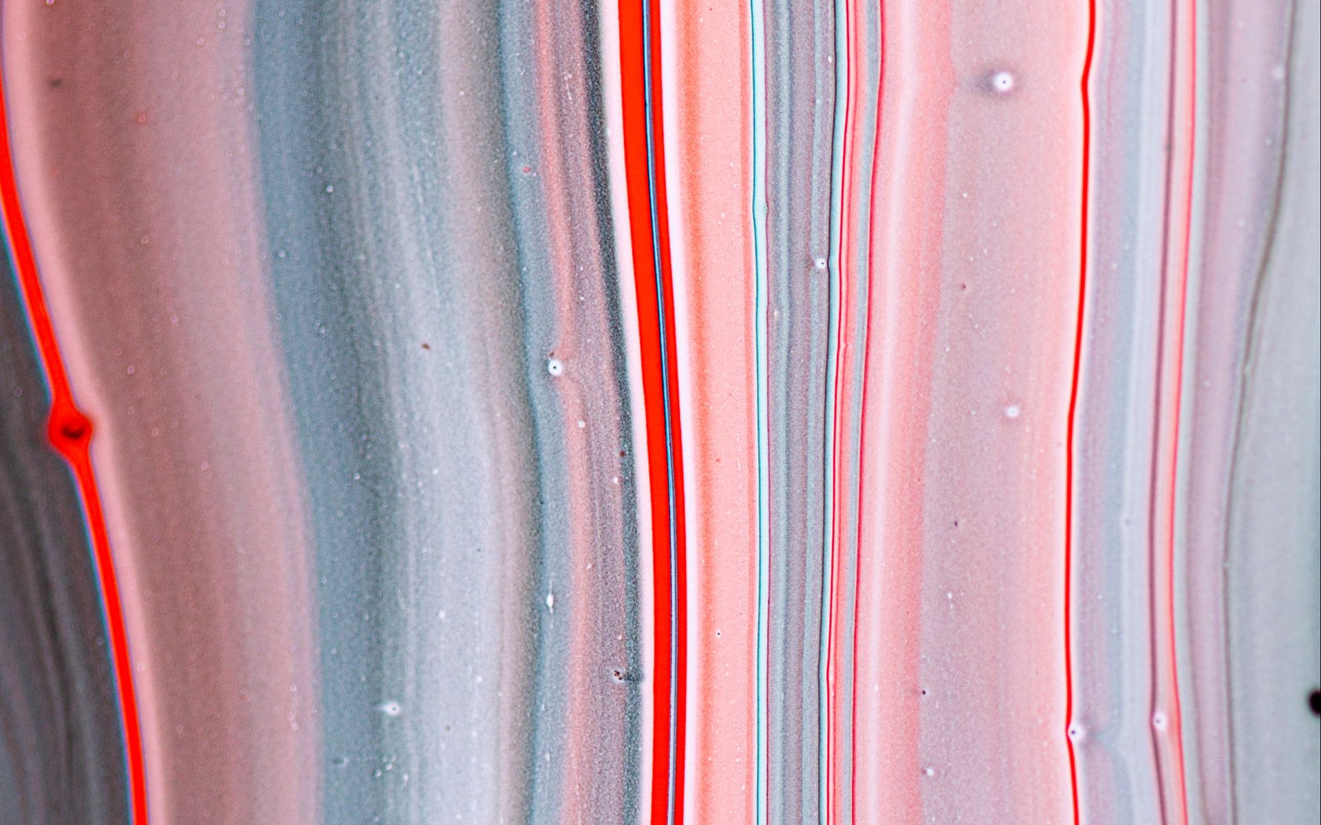 Description: A close up of a red and blue glass object with water droplets on it and a black object in the background.