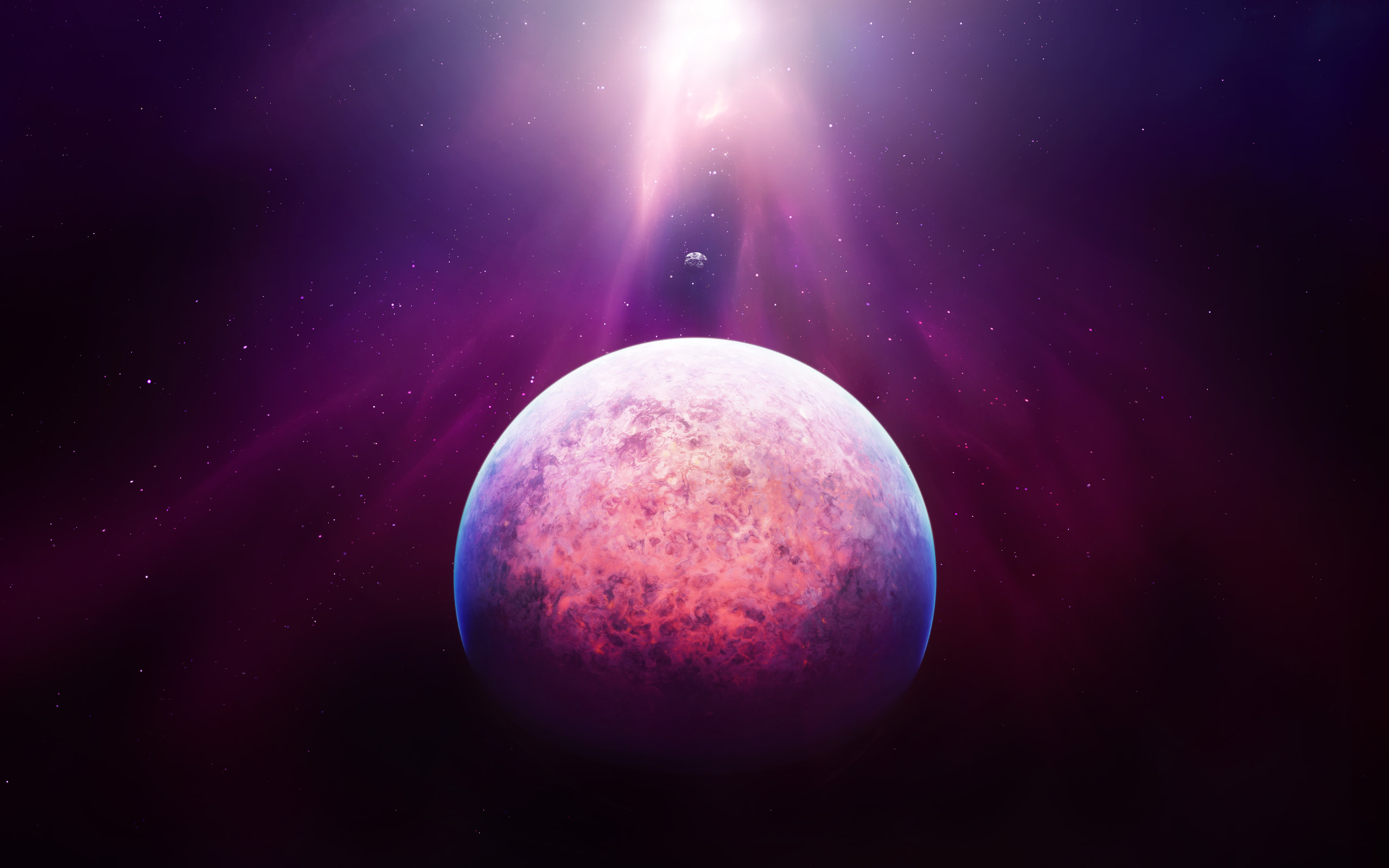 Description: A red and blue planet with a bright light coming from it's center and a star in the background.