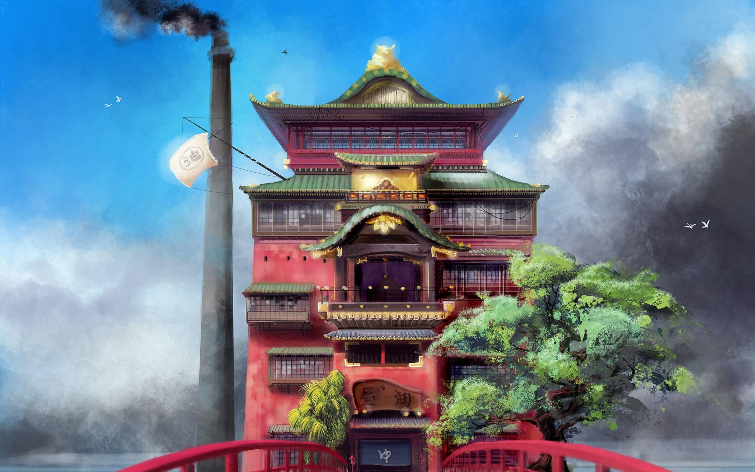 Description: A painting of a building with a red bridge and a red bridge in front of it and a tree.