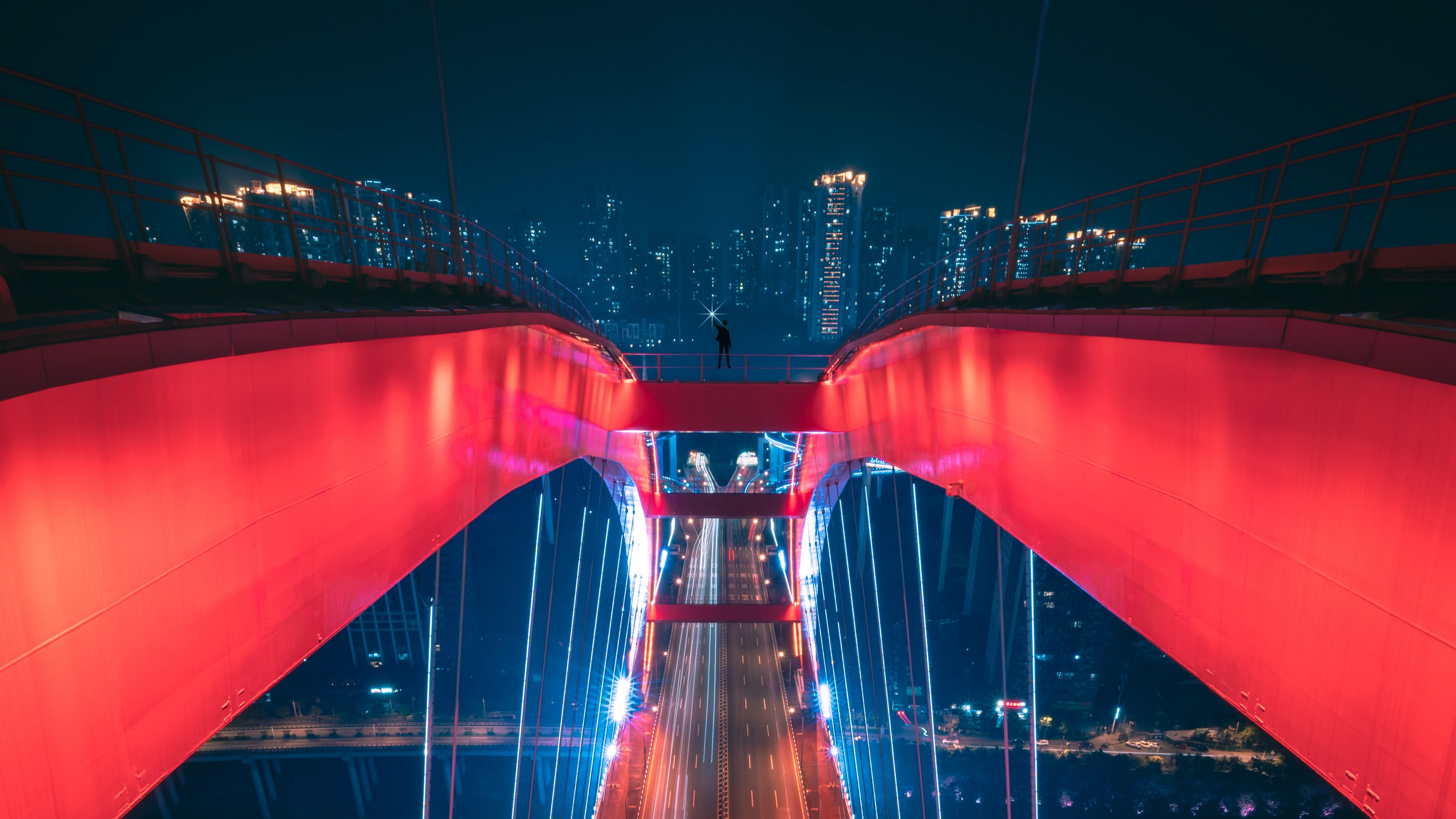 Description: A red bridge with a long red line going across it at night time with city lights in the background.