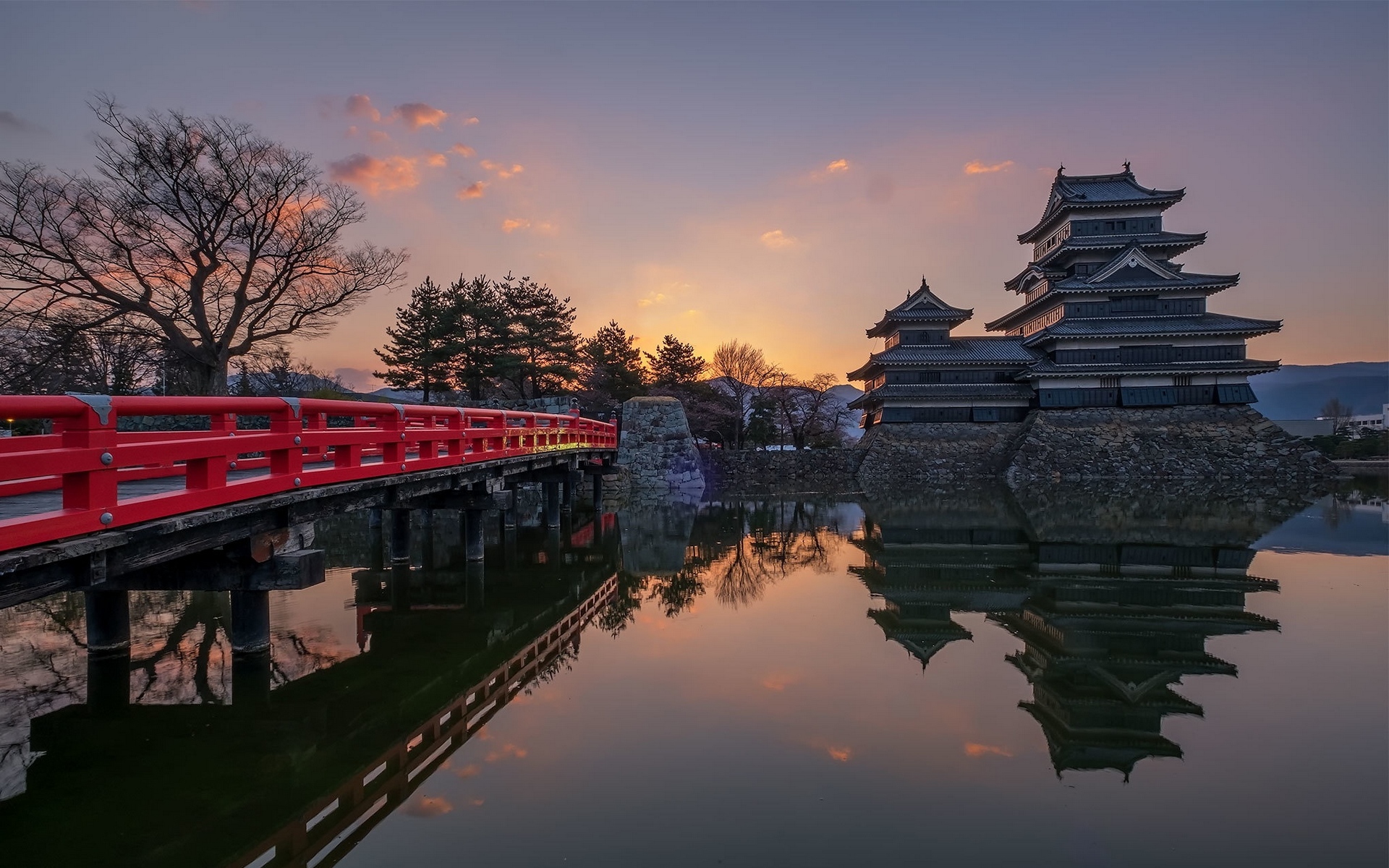 Description: A red bridge crosses over a body of water at sunset with a pagoda in the background and a reflection of the sky.