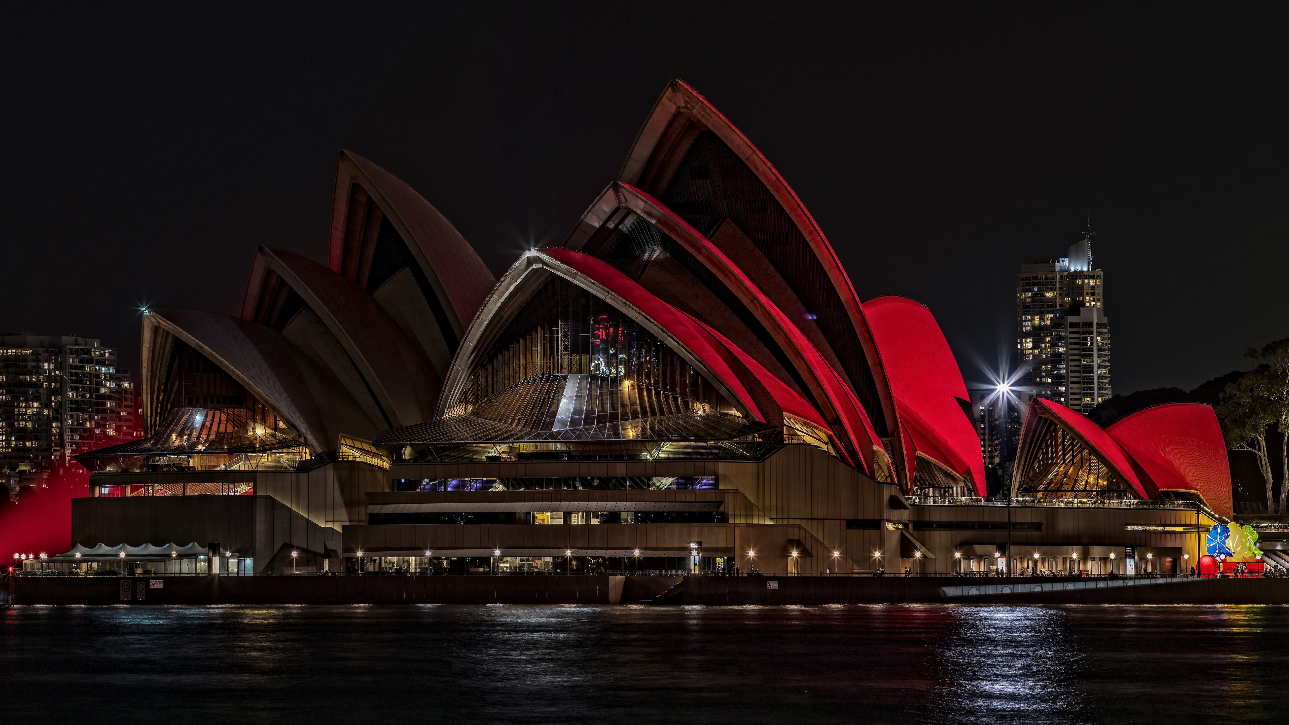 Description: A large red building with a lot of lights on it's sides and a city in the background.