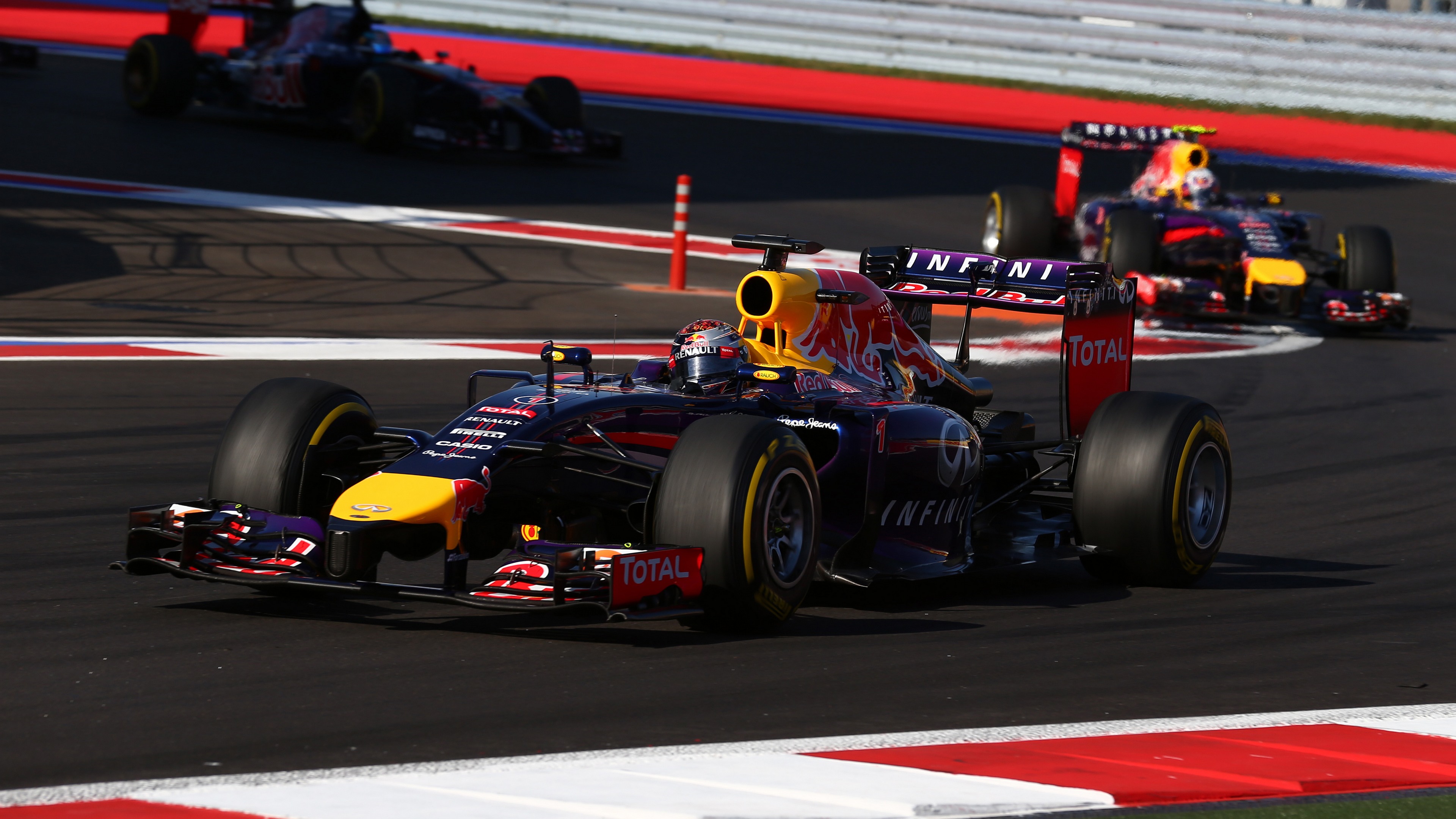 Description: A red bull racing car on a race track with another car behind it and another car behind it on a race track.