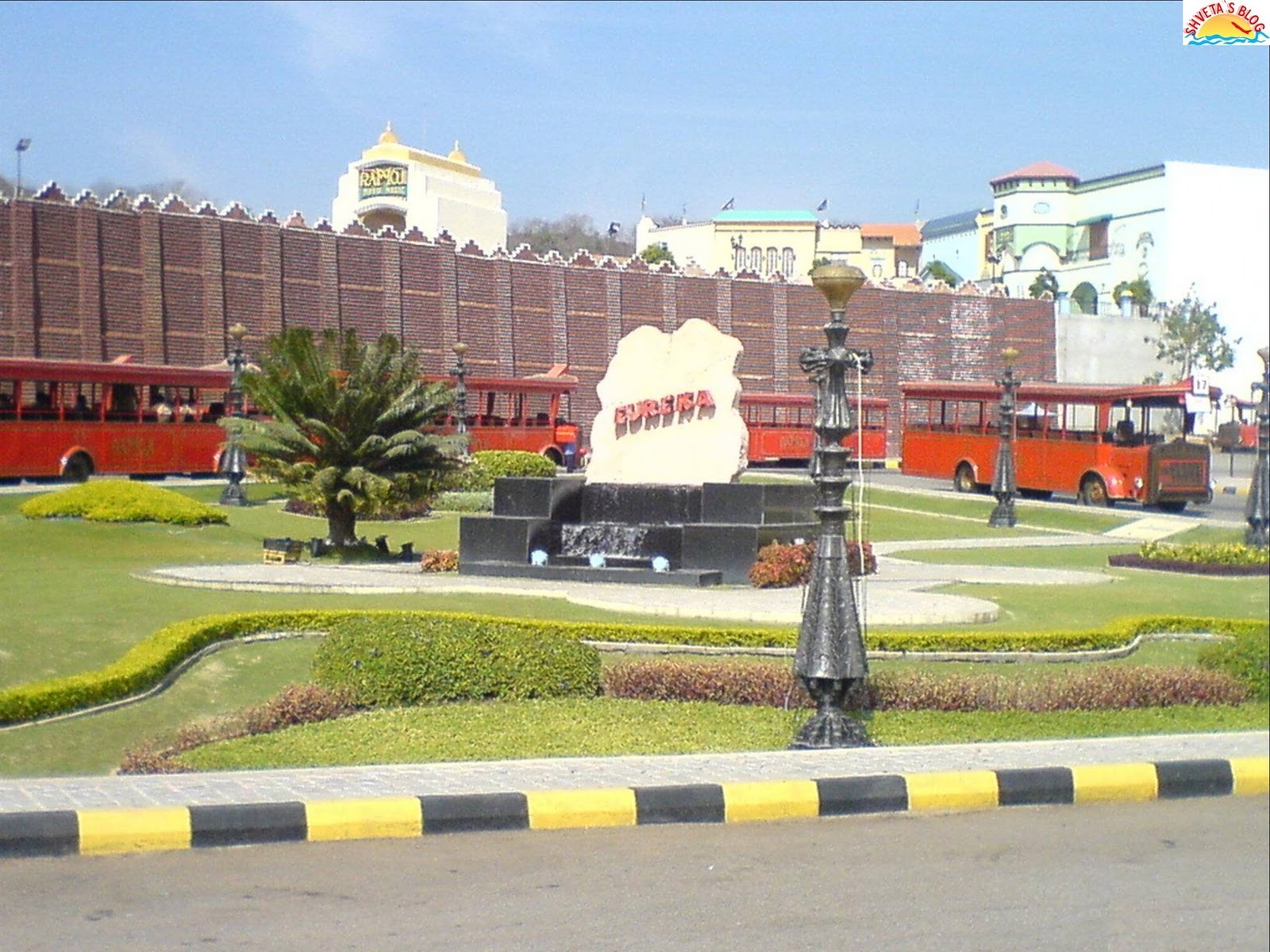 Description: A red bus is parked in front of a building with a sign that says bus stop on it and a light pole in the middle.