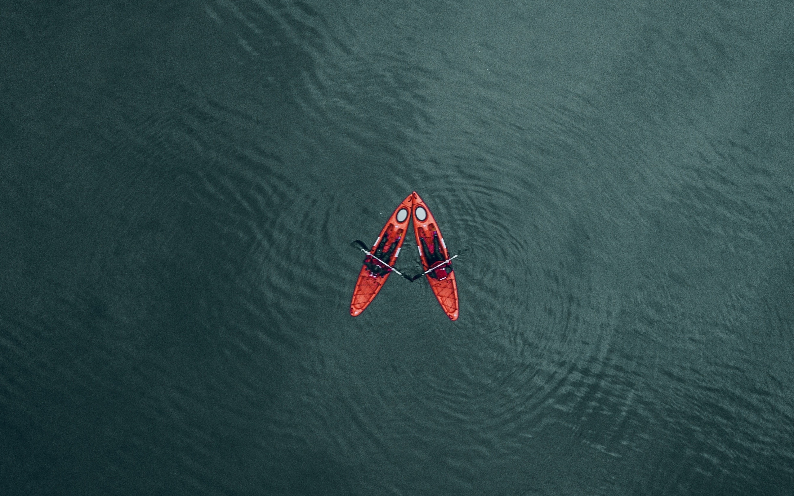 Description: A red canoe floating on top of a lake next to a forest of trees and a forest of trees.