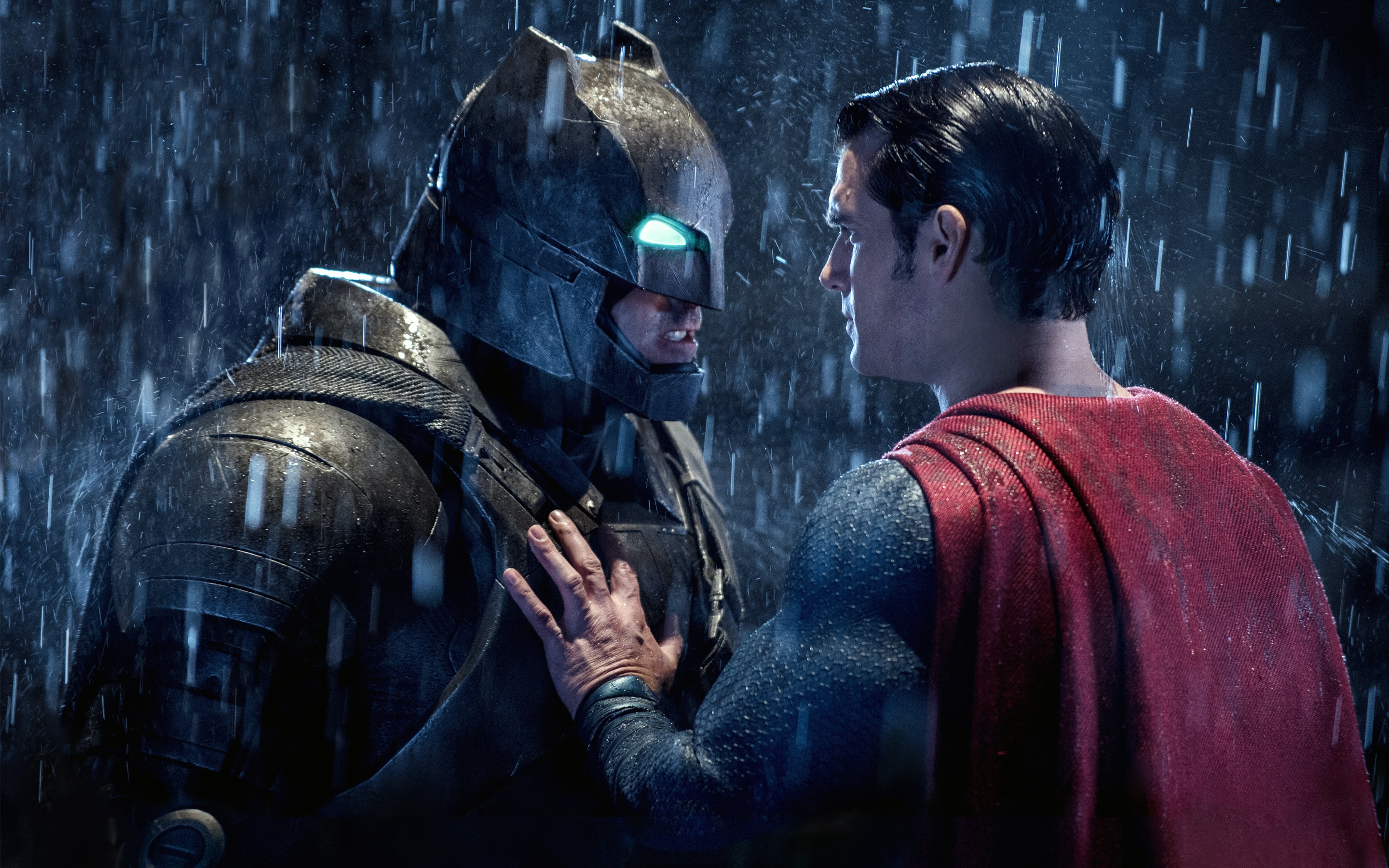 Description: A man in a red cape and a man in a black suit stand in the rain with their hands together.