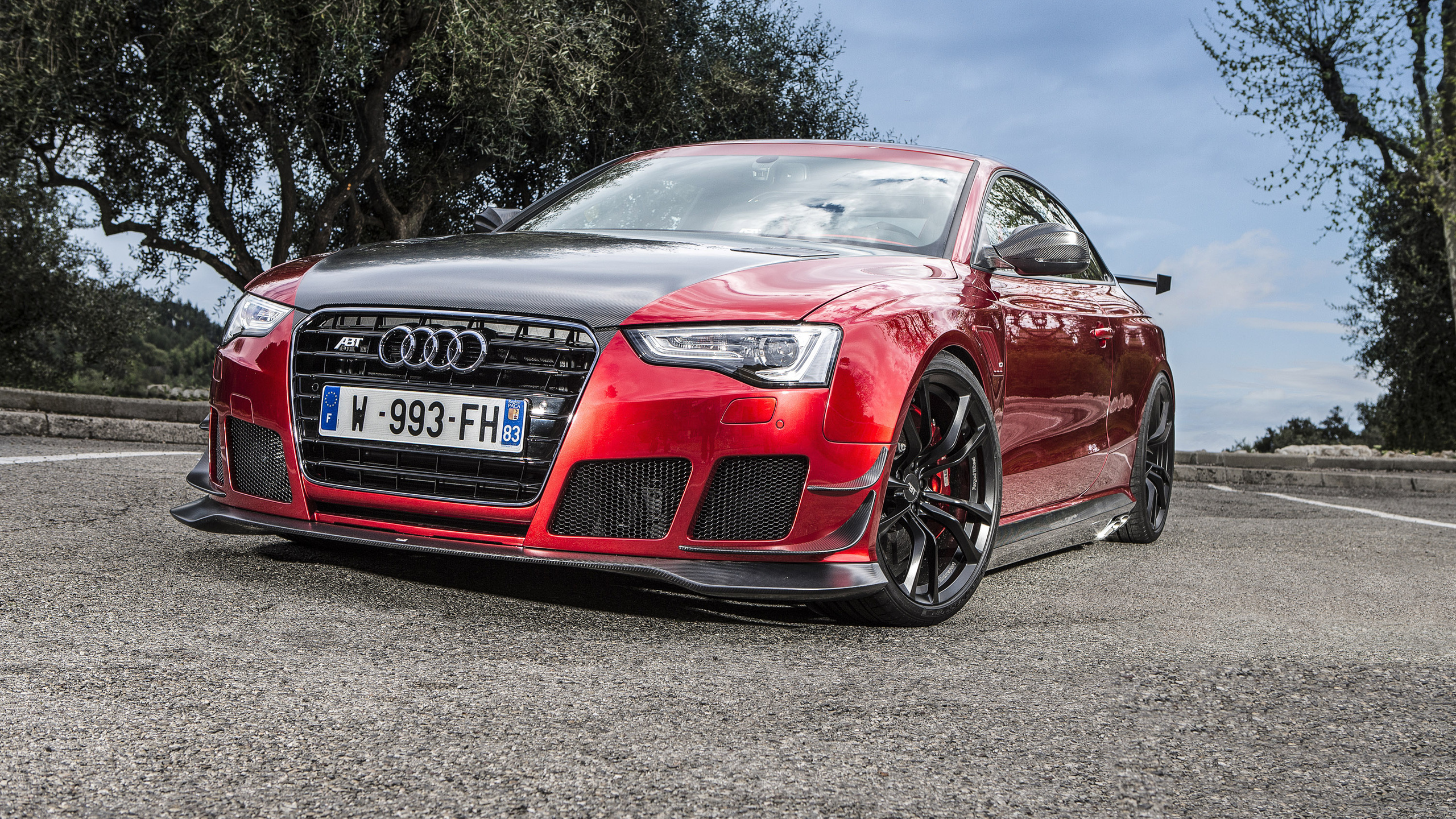 Description: A red car parked in a parking lot next to trees and a fence with a sky background and a blue sky.