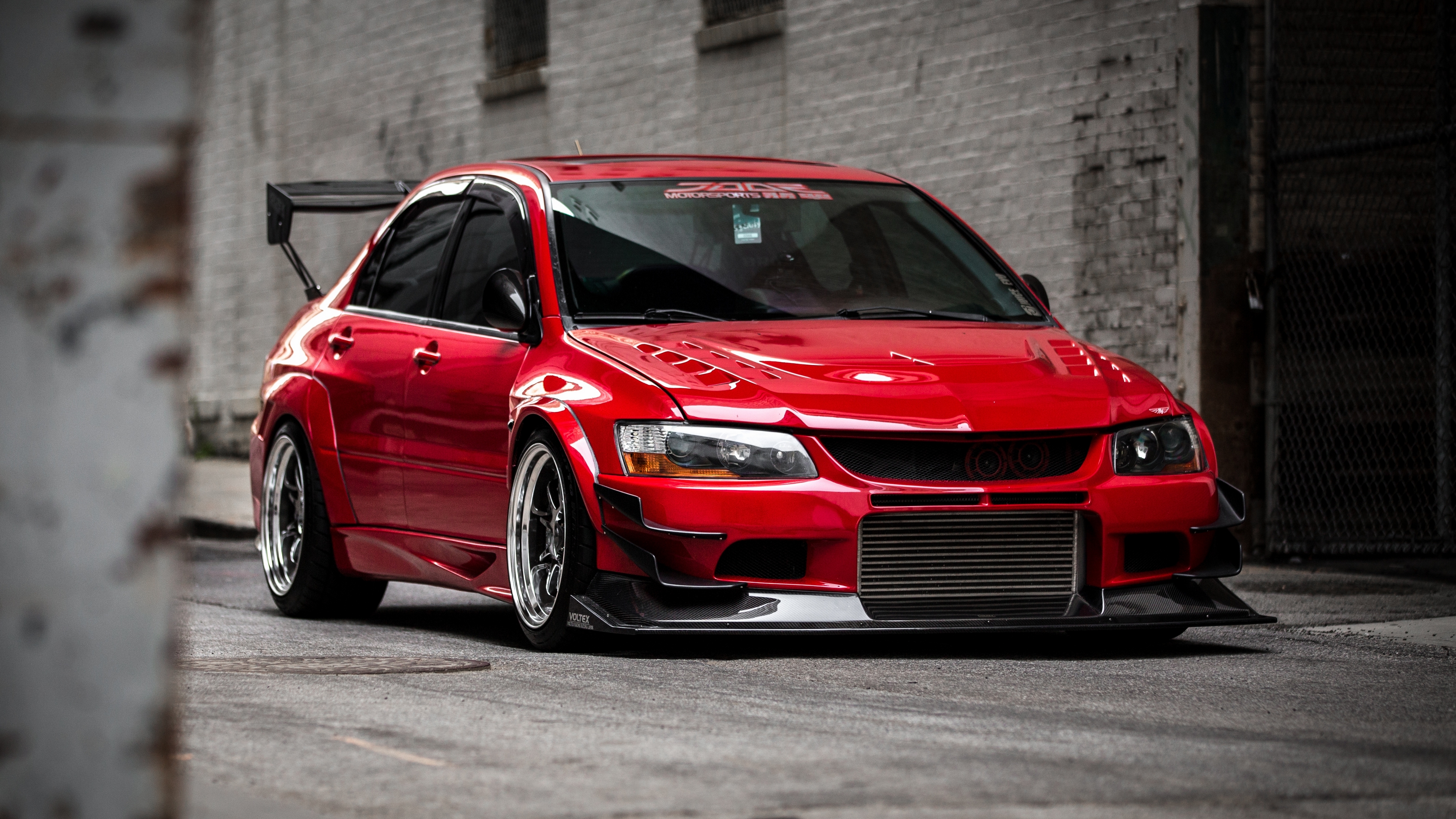 Description: A red car parked in front of a brick building with a black roof and a white door on the side of the car.