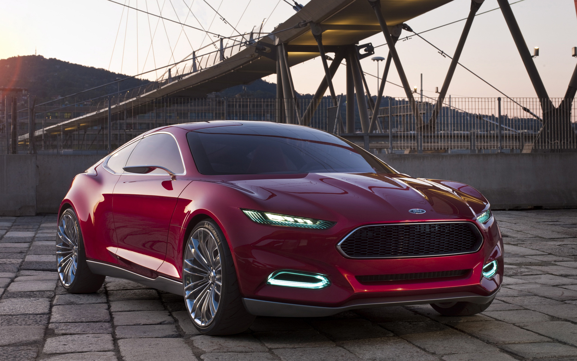 Description: A red car parked on a brick road near a bridge and a bridge in the background with a bridge in the background.