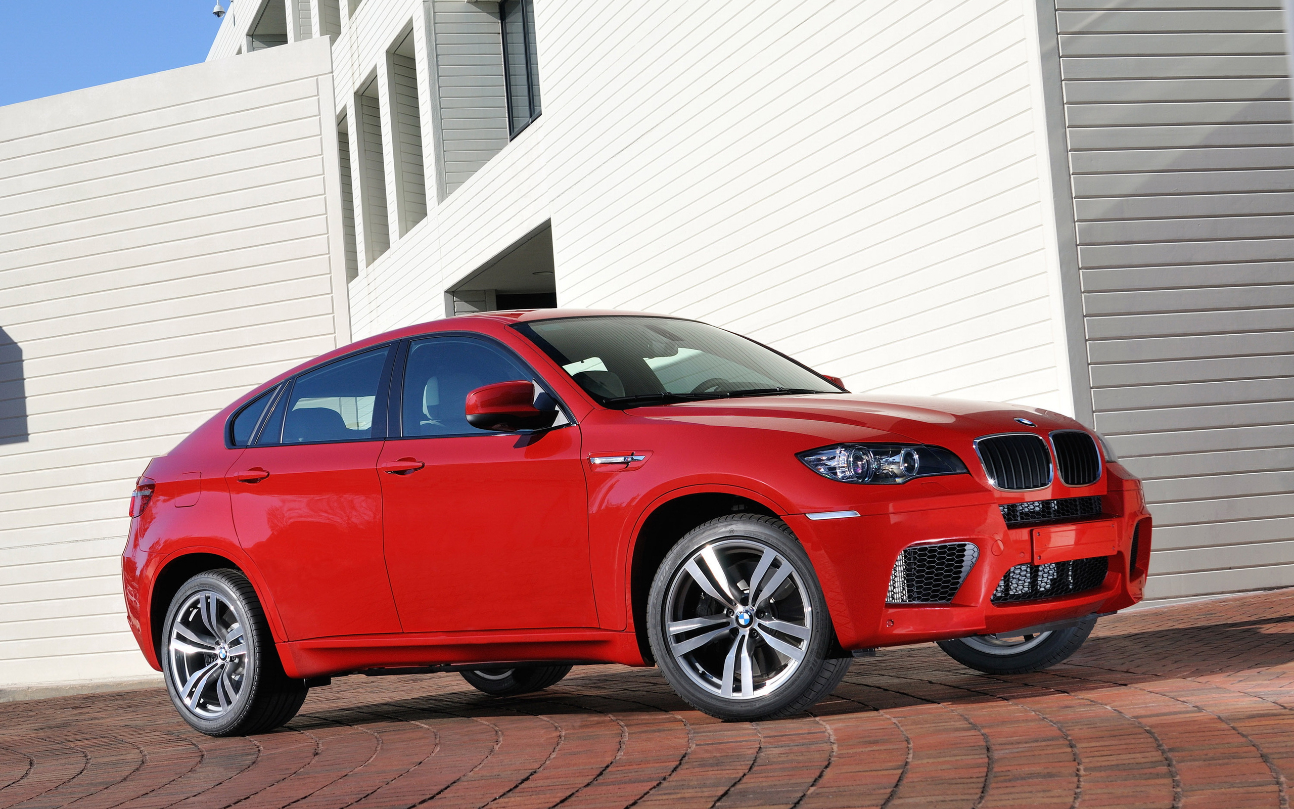 Description: A red car parked in front of a building on a brick road next to a white building with a white wall.