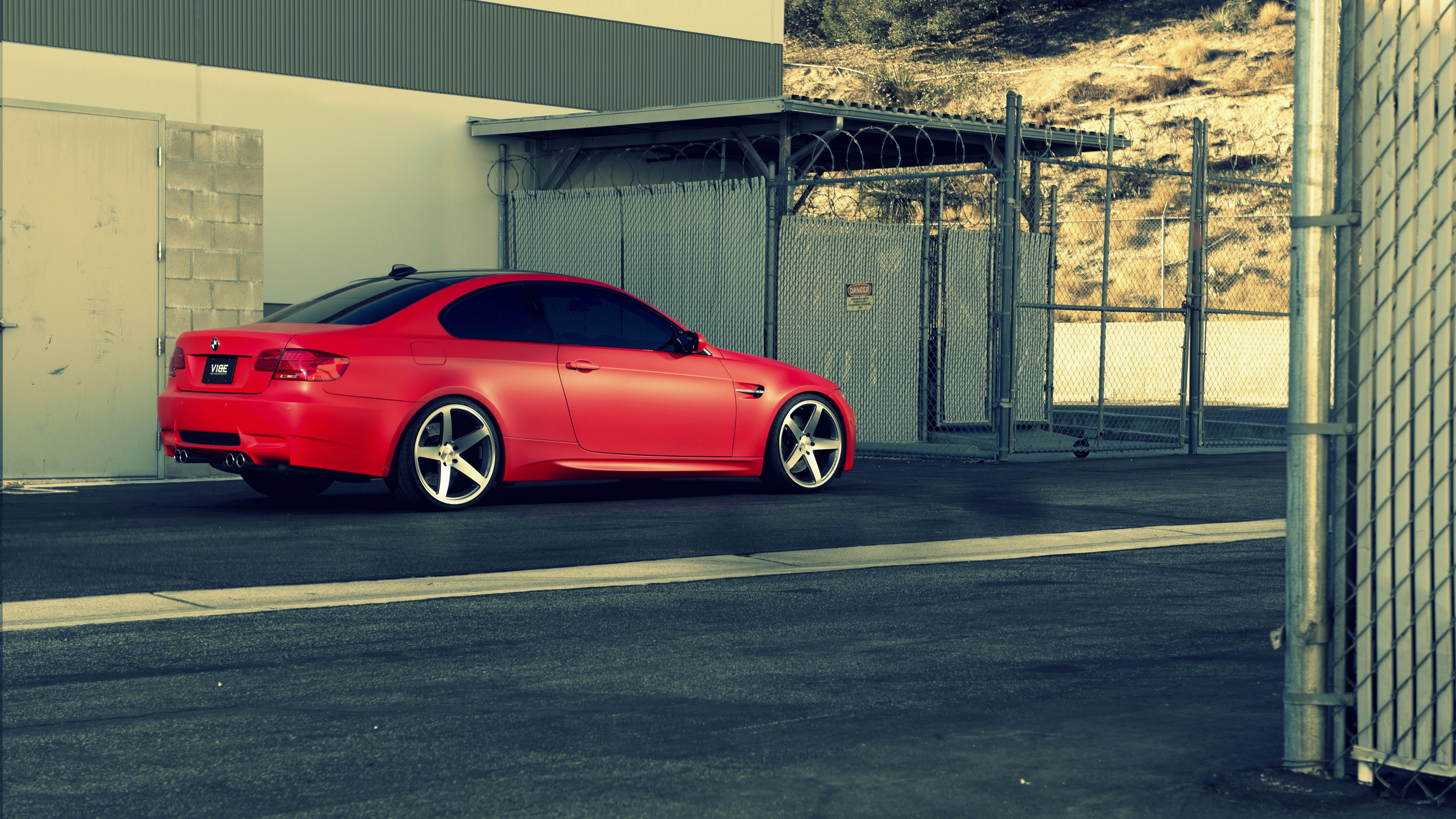 Description: A red car parked in front of a building on a street corner with a fence and a gate behind it.