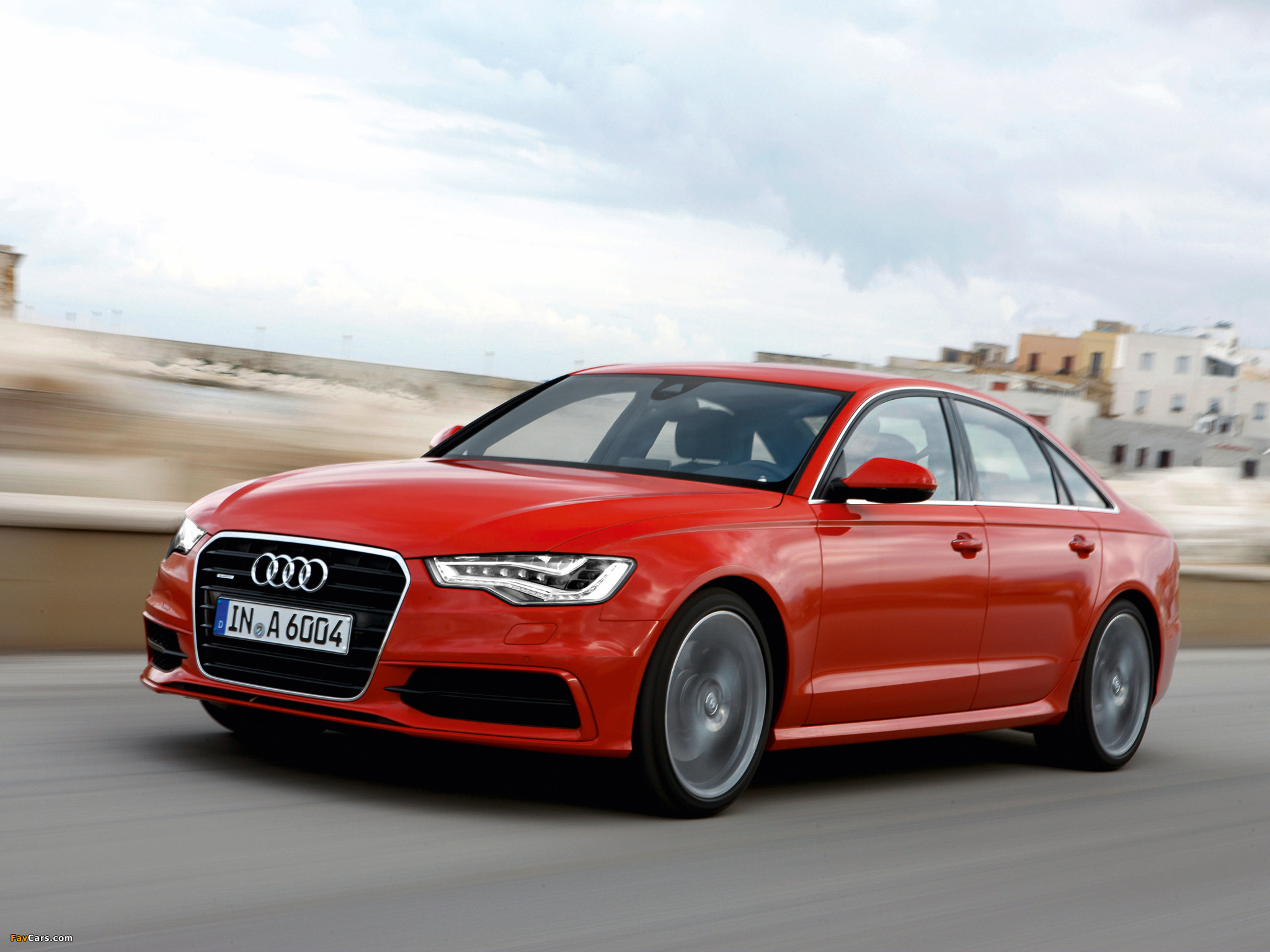 Description: A red car driving down a street next to a city skyline with buildings in the background and a cloudy sky.