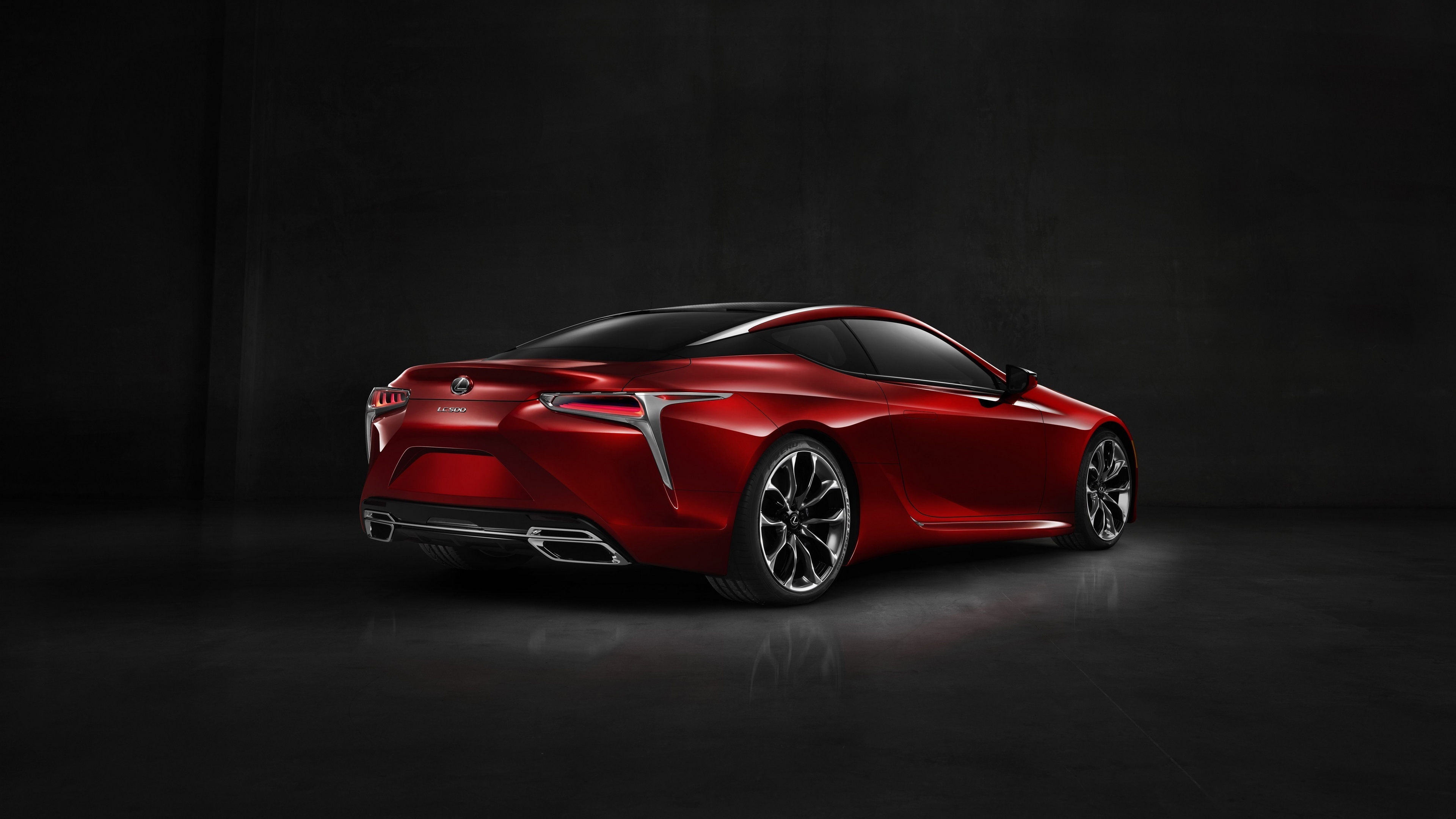 Description: A red car is shown in a dark room with a black background and a black background behind it is a black backdrop.