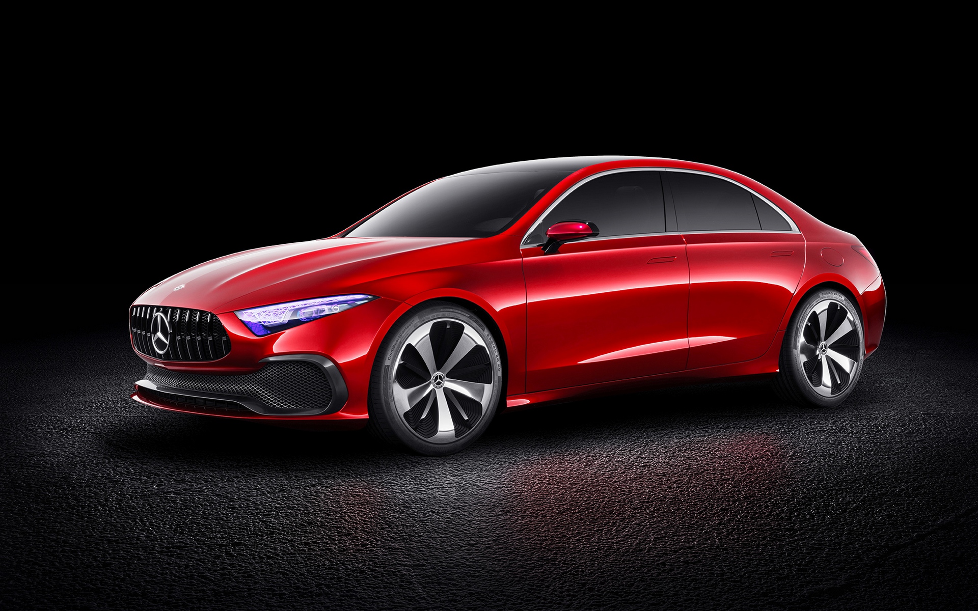 Description: A red car is shown in a dark room with a black background and a black background behind it is a black background.