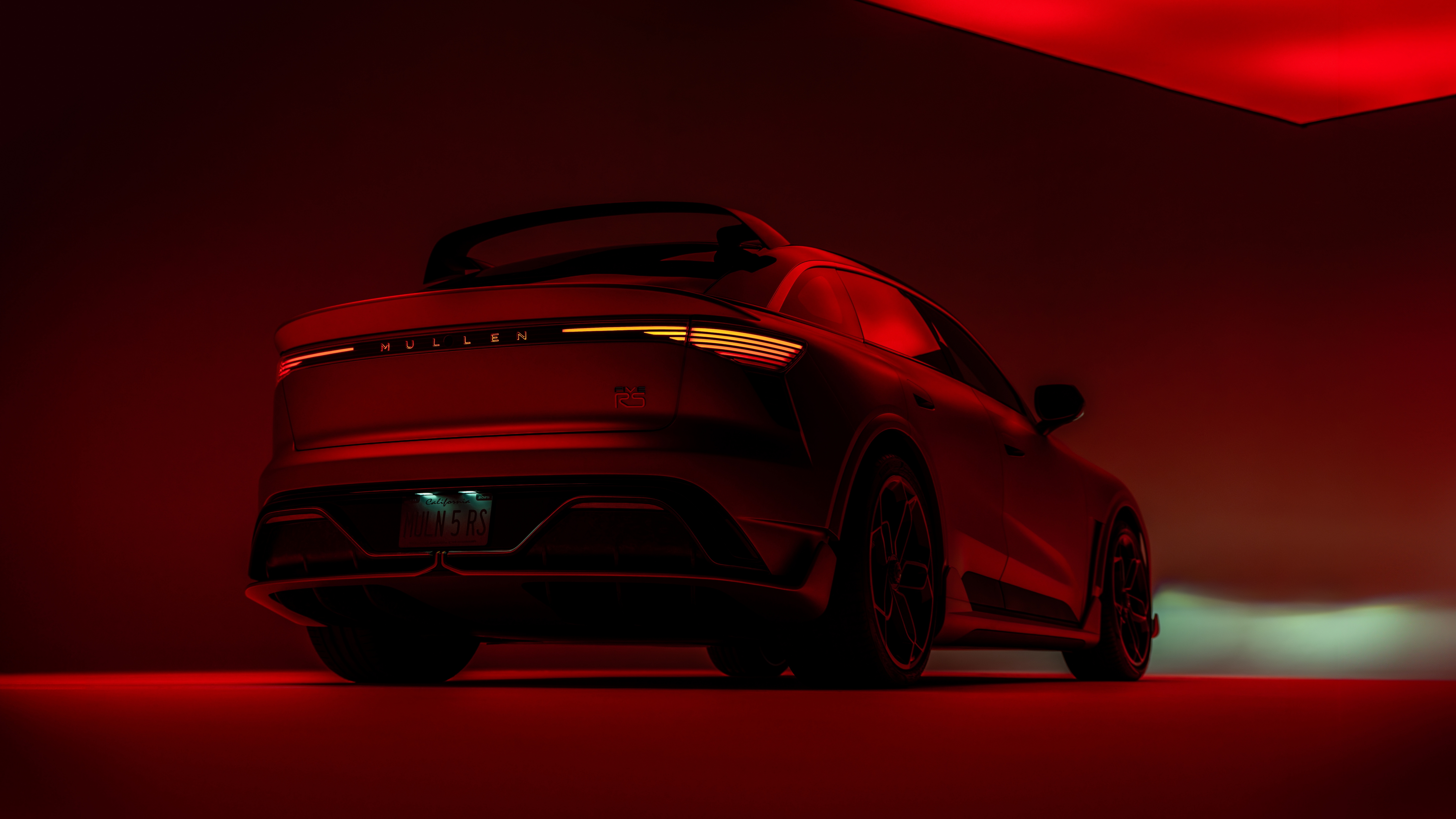 Description: A red car is shown in a dark room with a red light on it's side and a red light on the back.