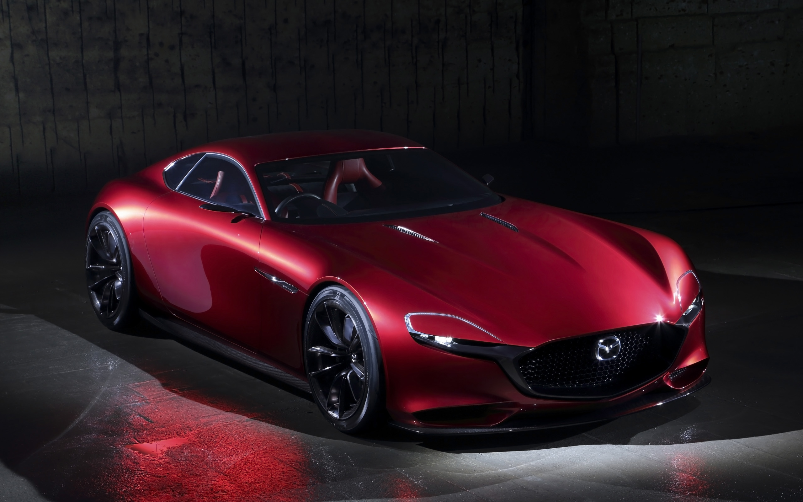 Description: A red car is shown in a dark room with a spotlight on the floor and a person standing in the car.