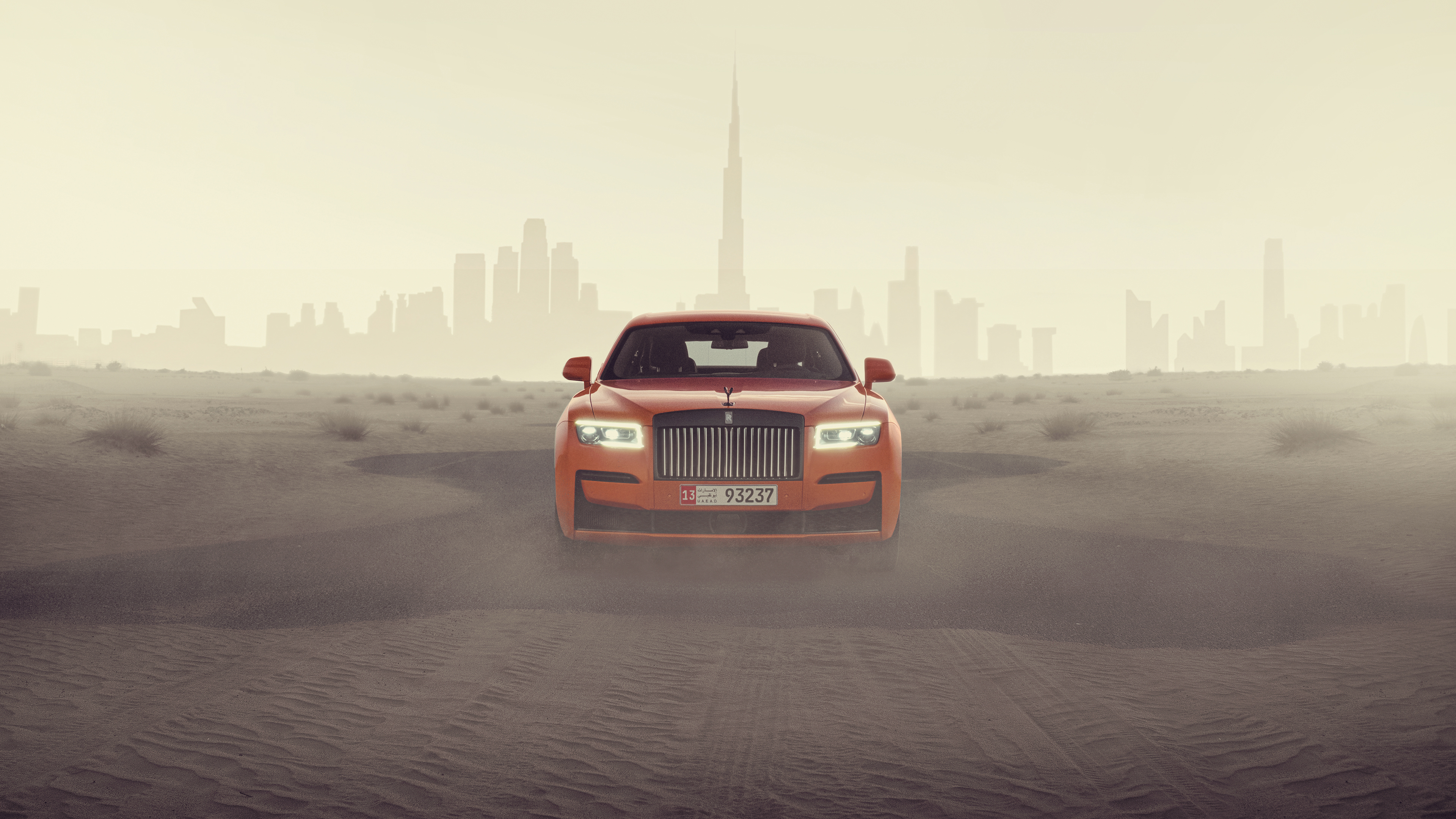 Description: A red car driving through a desert with a city in the background in the foggy day time with dust blowing around the front.