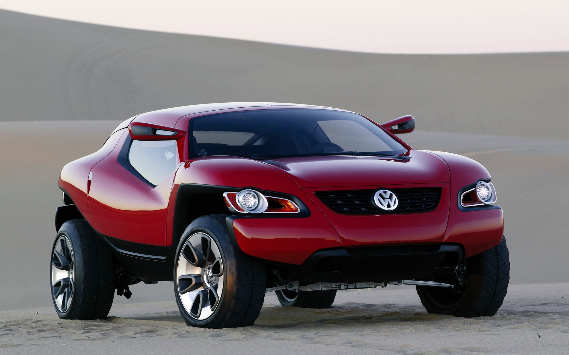 Description: A red car is parked in the desert with sand dunes in the background and a sand dune behind it.