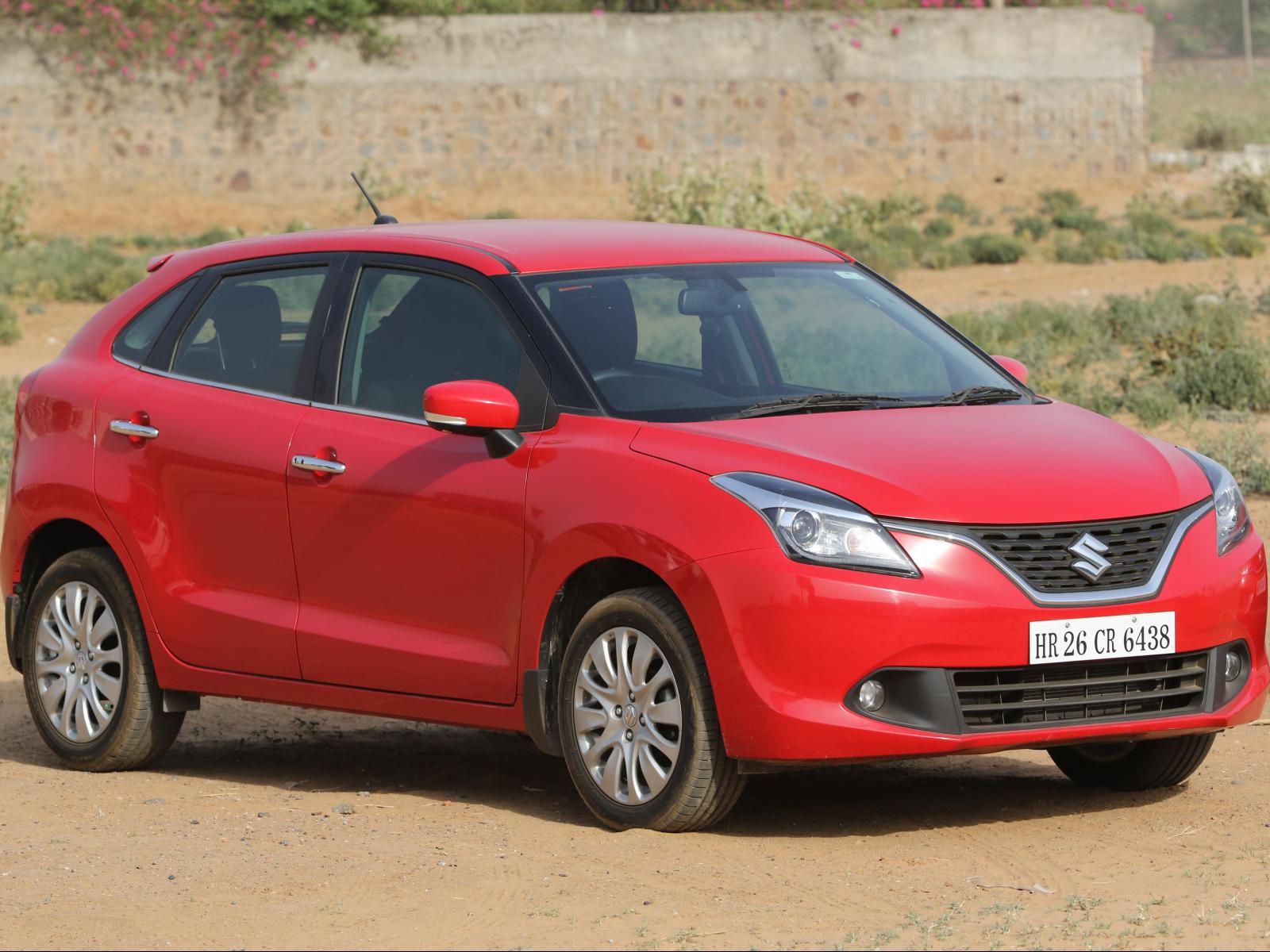 Description: A red car parked in a dirt lot next to a wall and bushes and a fenced in area.