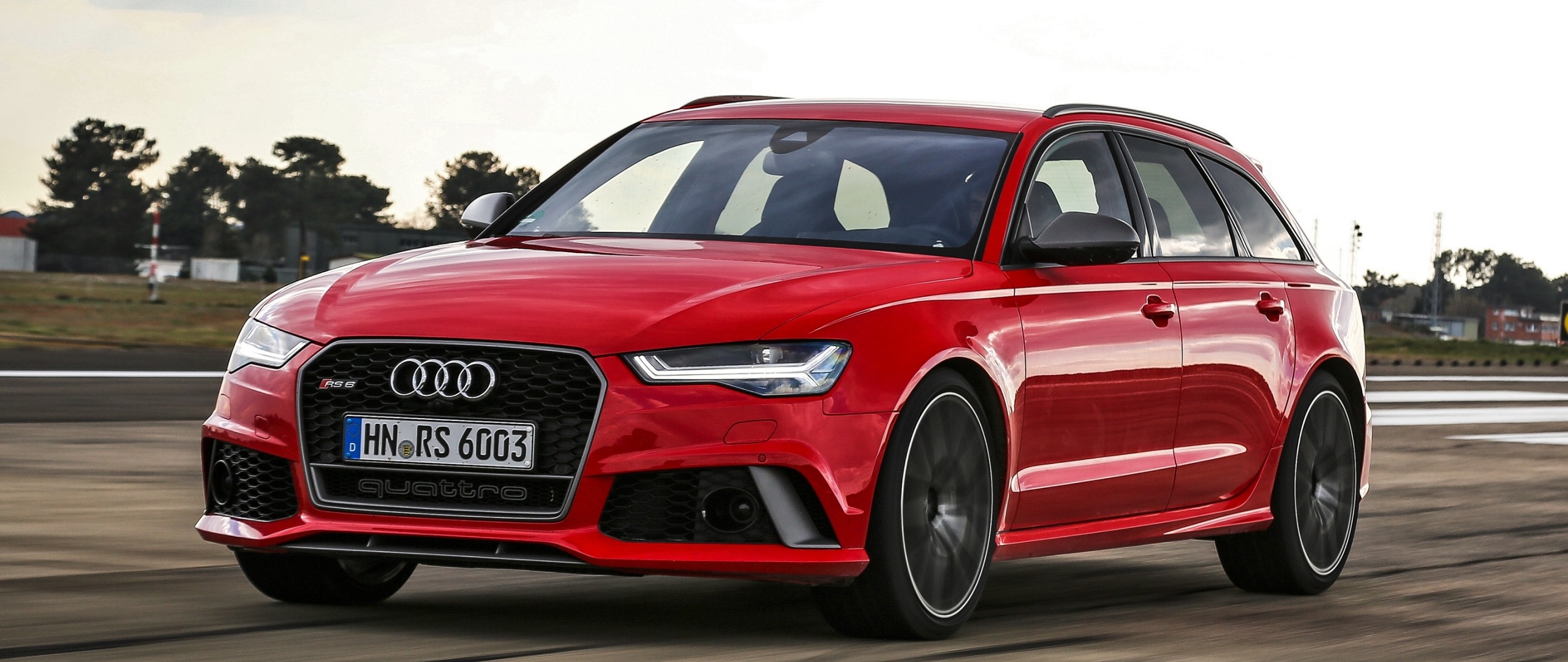 Description: A red car driving down a road next to a forest of trees and a fence with a sign on it.