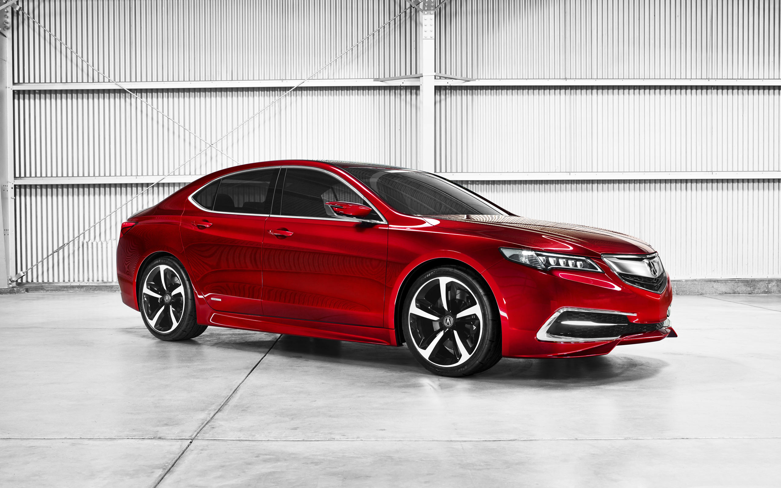 Description: A red car parked in a garage next to a wall of windows and a garage door with a white wall.