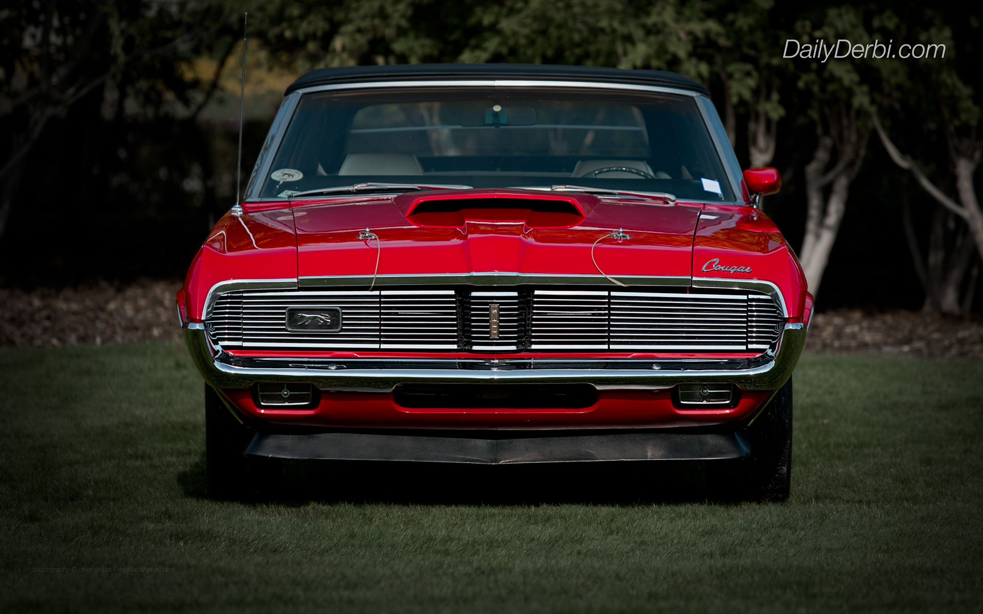 Description: A red car parked in a grassy area next to trees and bushes in the dark night time with a light on.