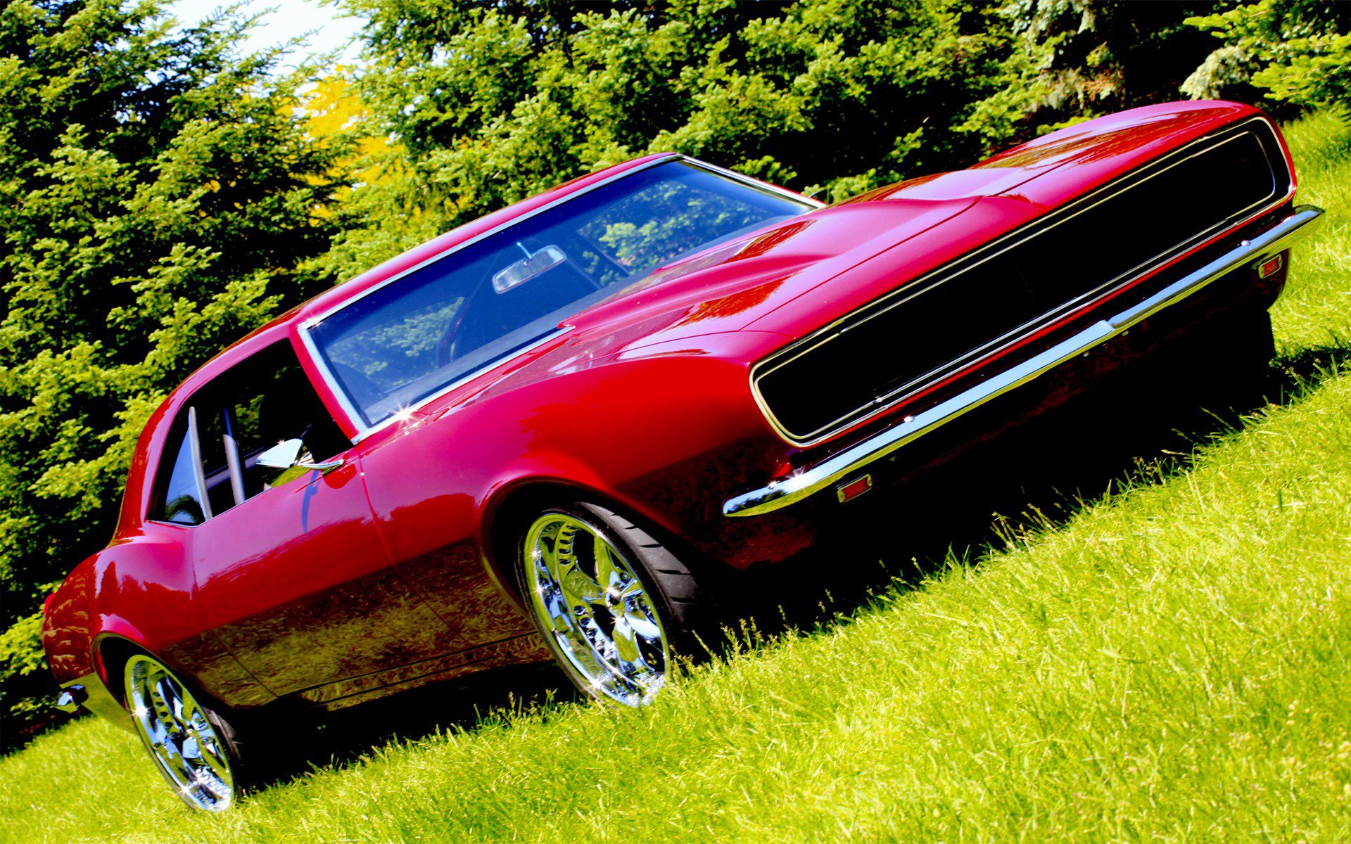 Description: A red car parked in a grassy field next to trees and bushes on a sunny day with a dog.