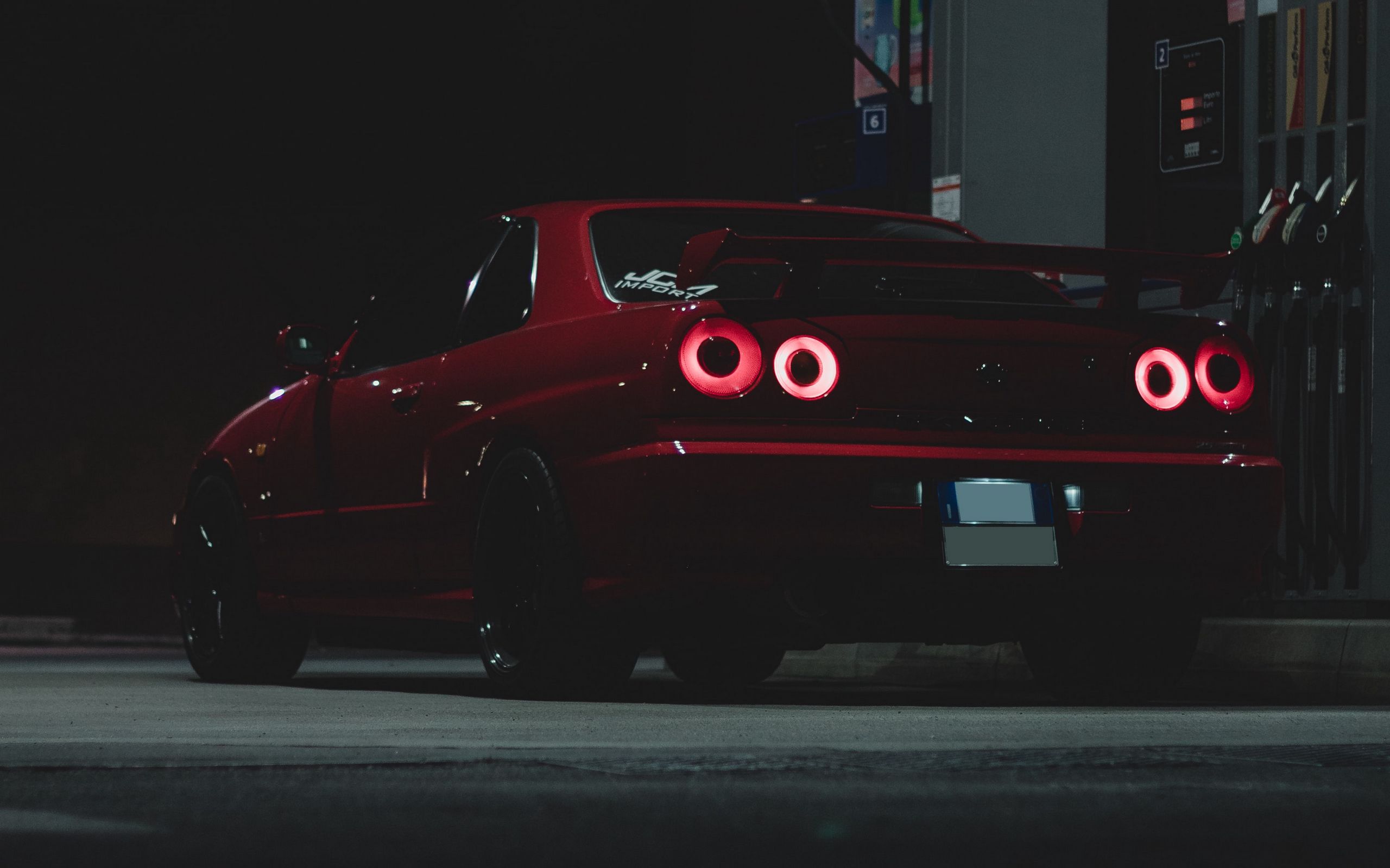Description: A red car with two red lights on it's headlights is parked in a parking lot at night.