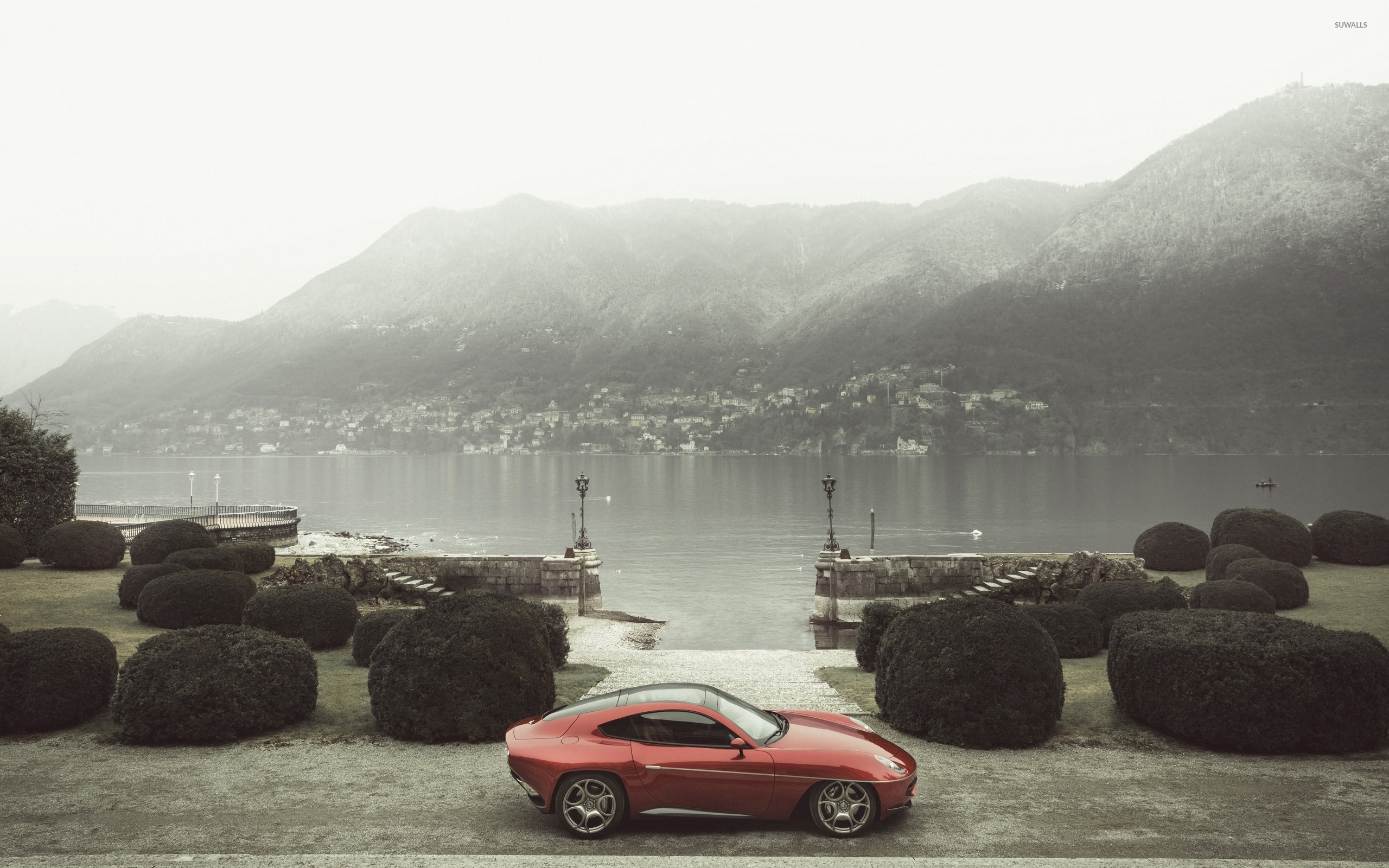 Description: A red car parked in front of a lake surrounded by bushes and bushes with mountains in the background and foggy sky.